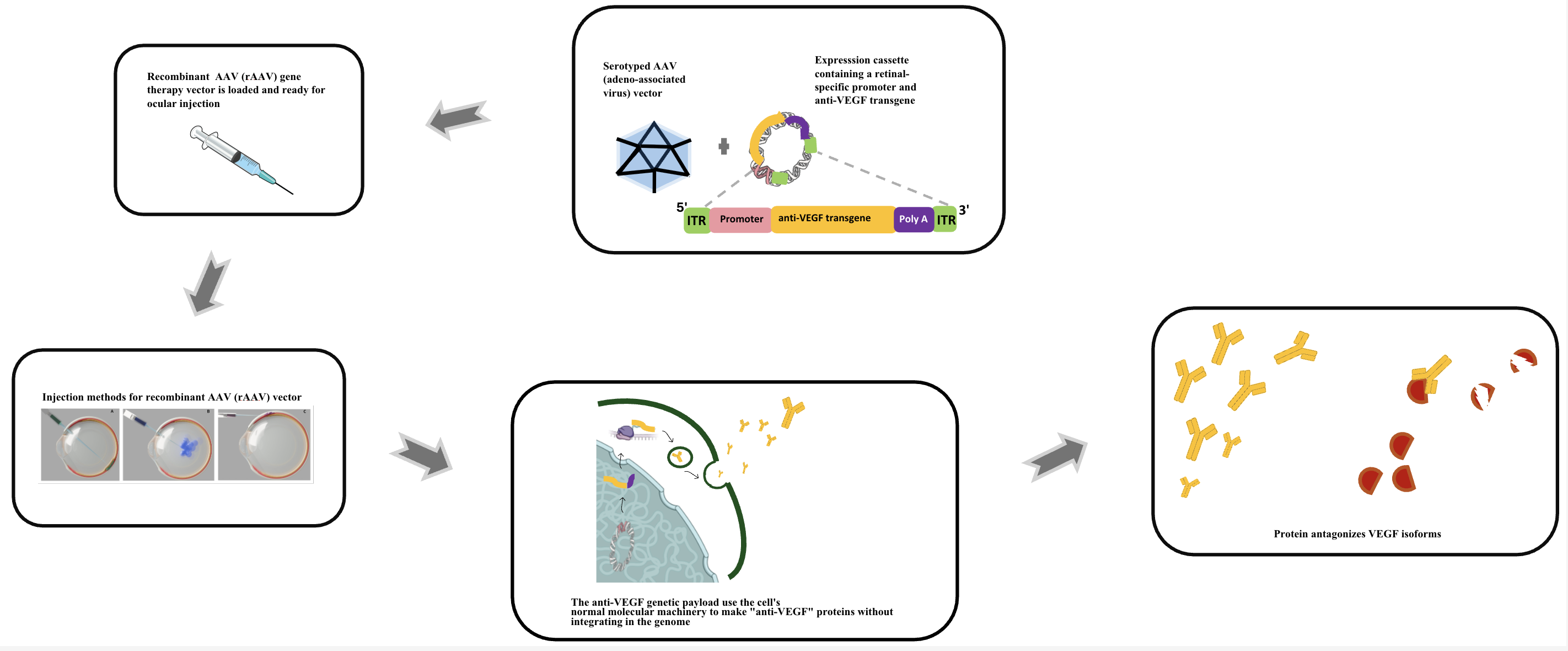 - Cai, Y.; Gu, Y.; Zhang, J.; Zhu, Y.; Ma, Z.; He, Q.; Sun, Y.; Yuan, M.; Li, X.; Zhu, K. An Engineered Intravitreal Injection Retinal-Pigment-Epithelium-Tropic Adeno-Associated Virus Vector Expressing a Bispecific Antibody Binding VEGF-A and ANG-2 Rescues Neovascular Age-Related Macular Degeneration in Animal Models and Patients. Research 2025, 8, 0717. [Google Scholar] [CrossRef]
