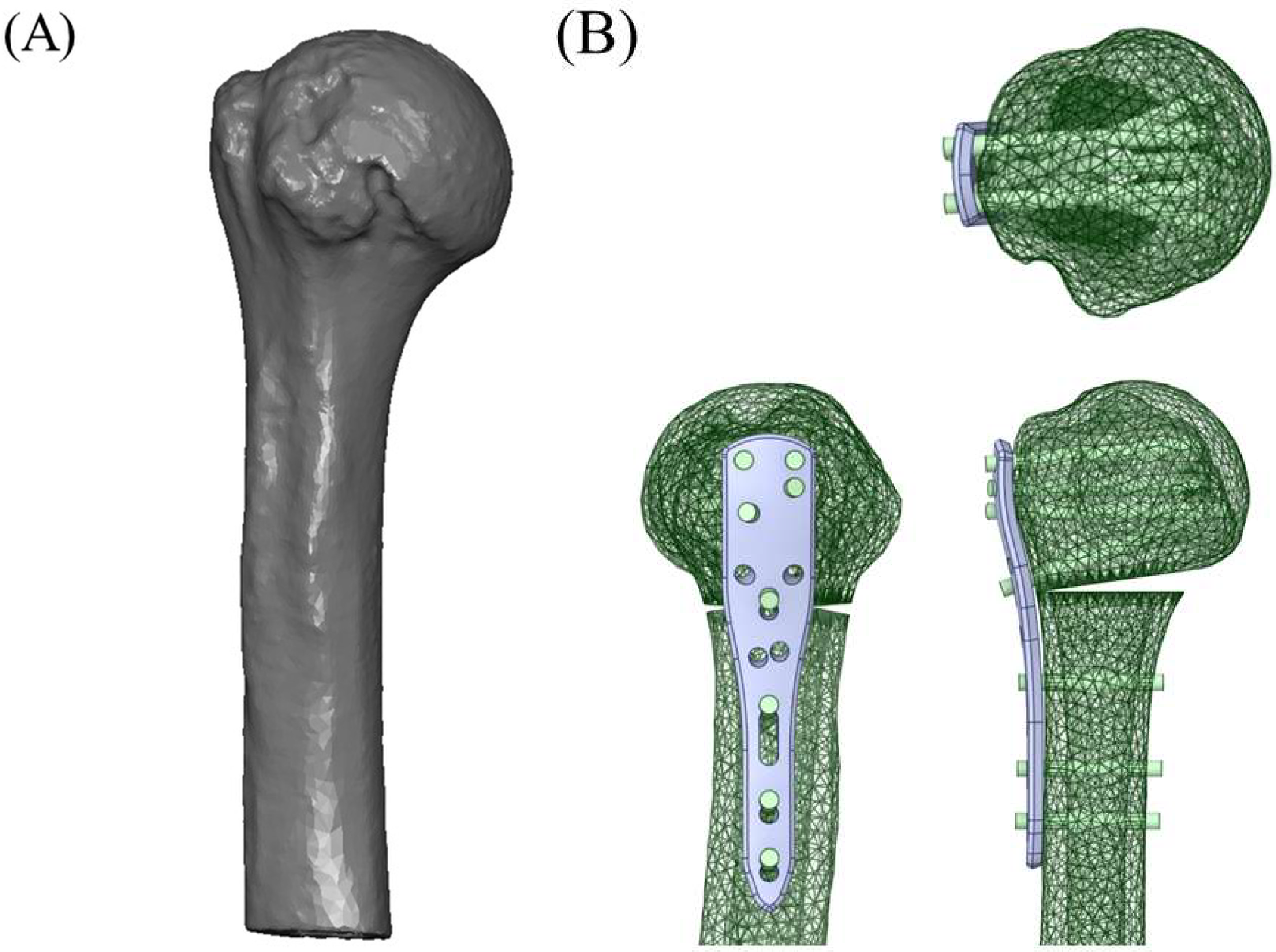 - Zhang, W.; Zeng, L.; Liu, Y.; Pan, Y.; Zhang, W.; Zhang, C.; Zeng, B.; Chen, Y. The mechanical benefit of medial support screws in locking plating of proximal humerus fractures. PLoS ONE 2014, 9, e103297. [Google Scholar] [CrossRef] [PubMed]