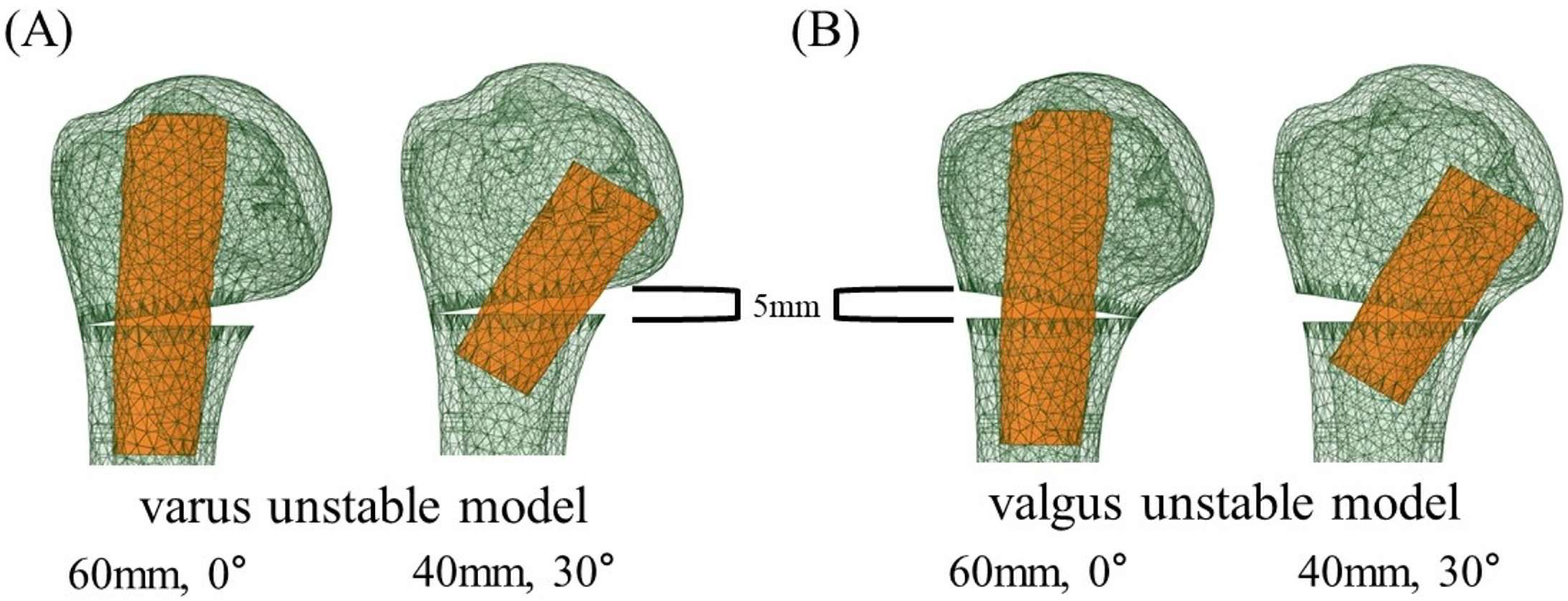 3.1. Von Mises Stress in the Plate and Maximum Principal Stress in the Fibular Graft in the Varus Unstable (Medial Wedge-Out) Model