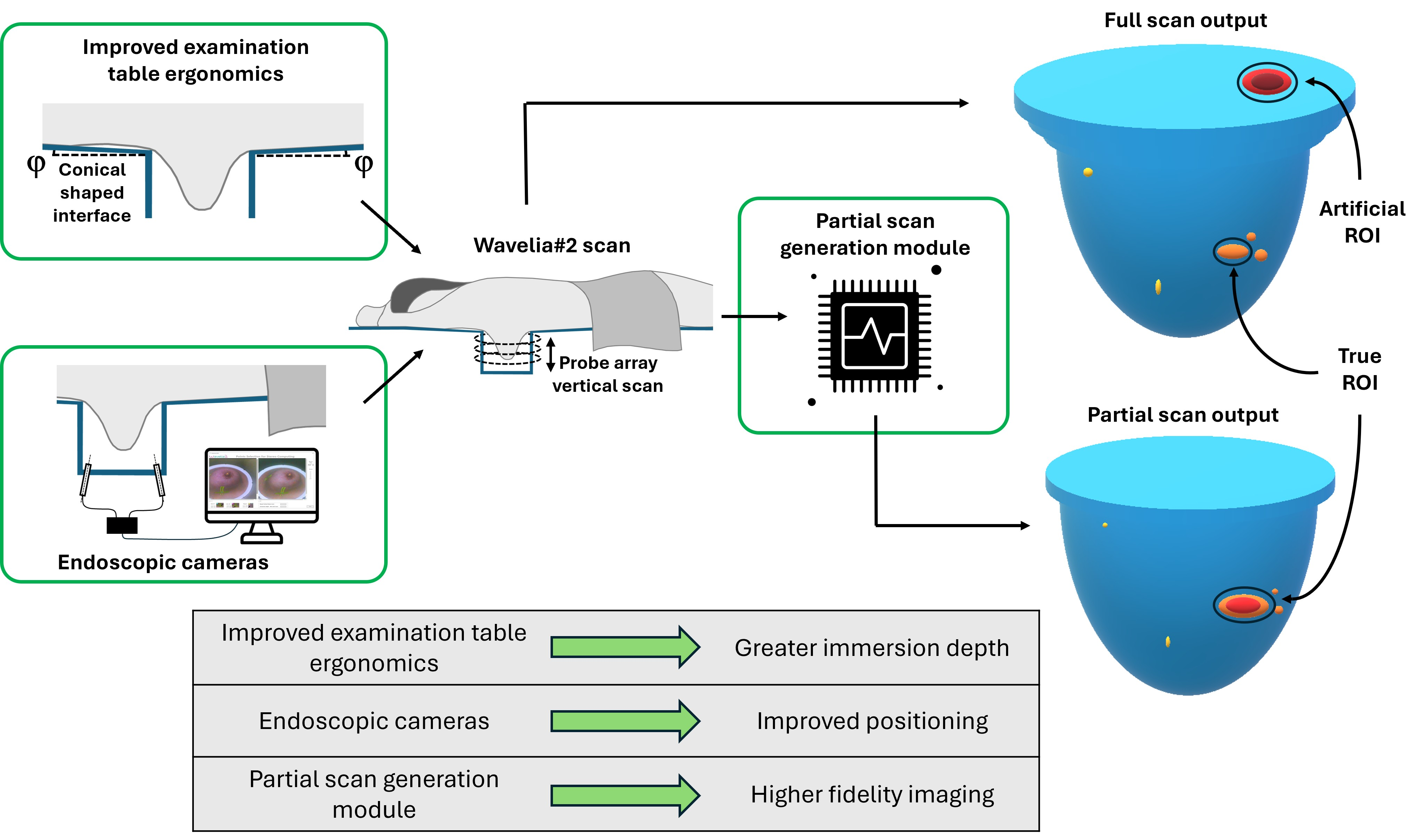 - Ergonomic accessories, which contribute to improved immersion of the breast in the transition liquid and deeper ultimate insertion in the scanning zone.