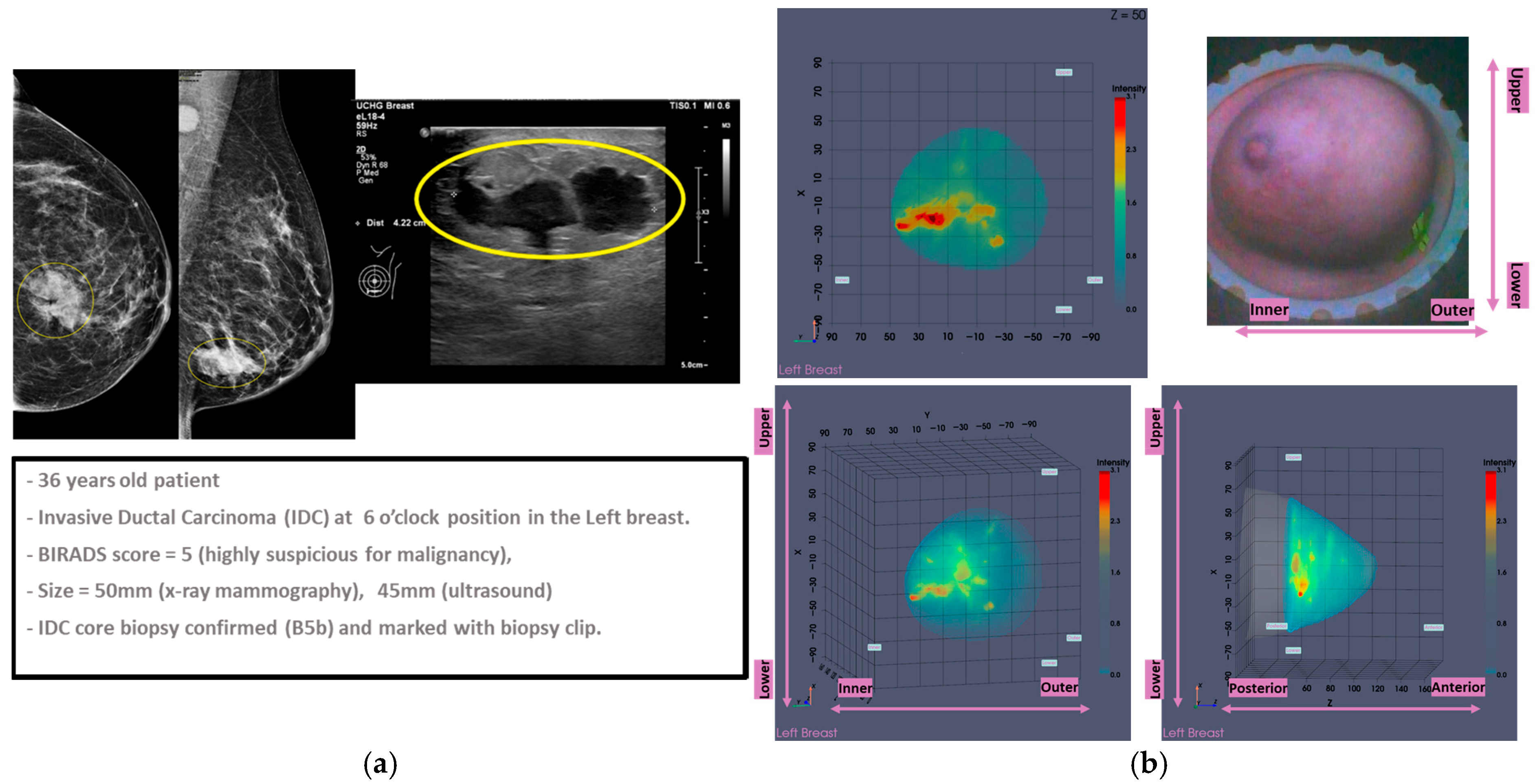 - Sidebottom, R.; Webb, D.; Bishop, B.; Mohammed, K.; Allen, S. Results for the London investigation into dielectric scanning of lesions study of the MARIA® M6 breast imaging system. Br. J. Radiol. 2024, 97, 549–552. [Google Scholar] [CrossRef]