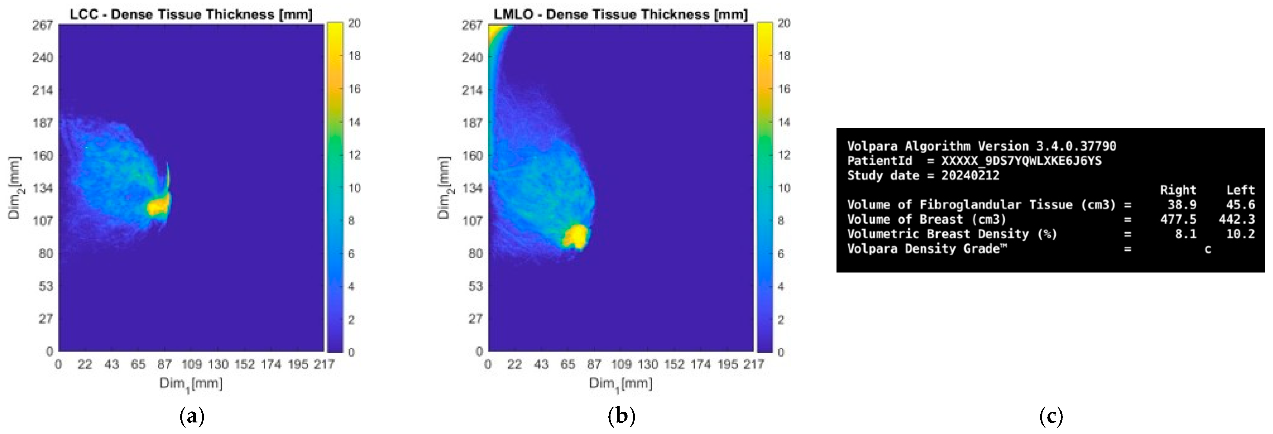 - Highnam, R.; Brady, M.; Yaffe, M.J.; Karssemeijer, N.; Harvey, J. Robust breast composition measurement-VolparaTM. In Lecture Notes in Computer Science (Including Subseries Lecture Notes in Artificial Intelligence and Lecture Notes in Bioinformatics); Springer: Berlin/Heidelberg, Germany, 2010. [Google Scholar] [CrossRef]