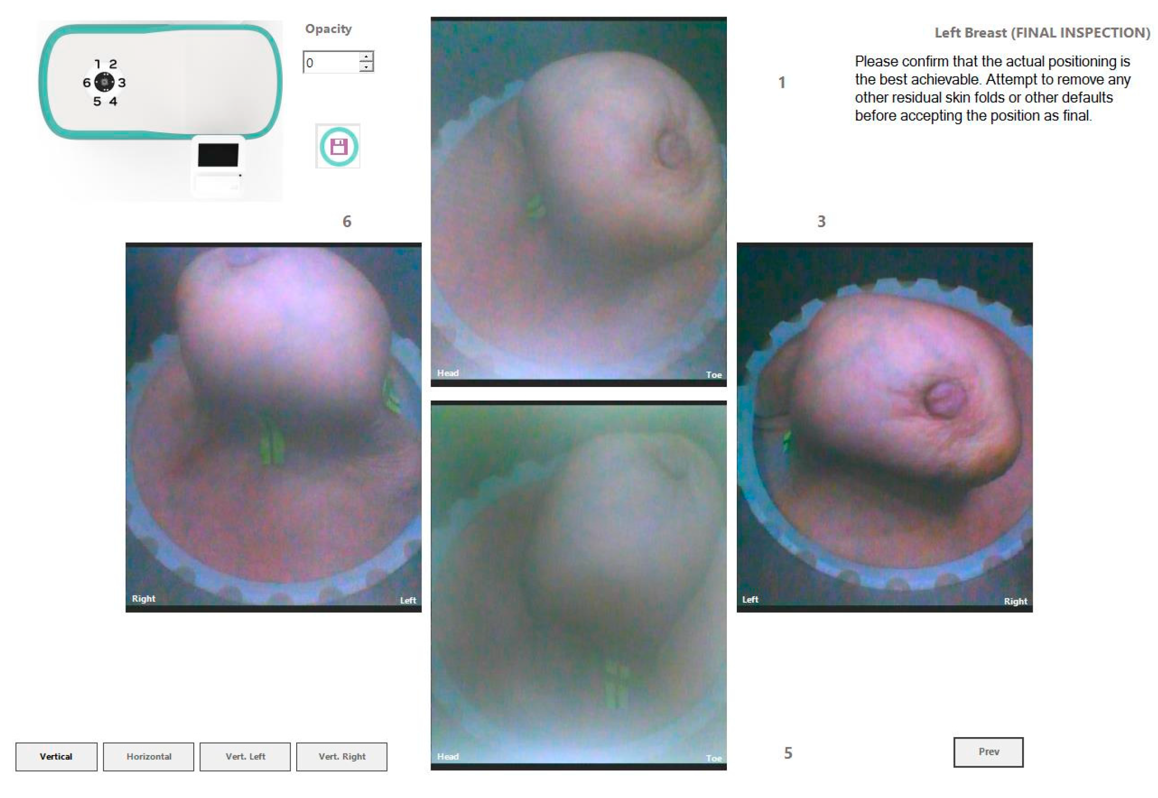- An optical system embedded in the MWBI scanner and contributing to: (a) significant improvement in breast positioning in the scanner, (b) better management of the achieved quality of scan, and (c) rationalization of the ROI localization in the MWBI images and its association to pre-diagnosed lesions in reference imaging data, in cases of misaligned, non-vertical and/or twisted insertion of the breast in the MWBI scanner. This new optical system was introduced in the pilot clinical investigation with Wavelia#2, while the Optical Breast Contour Detection (OBCD) subsystem that was implemented in a separate examination table and formed part of the Wavelia#1 scanner, as presented in detail in [39] and employed during the FiH clinical investigation, was rendered obsolete for Wavelia#2.