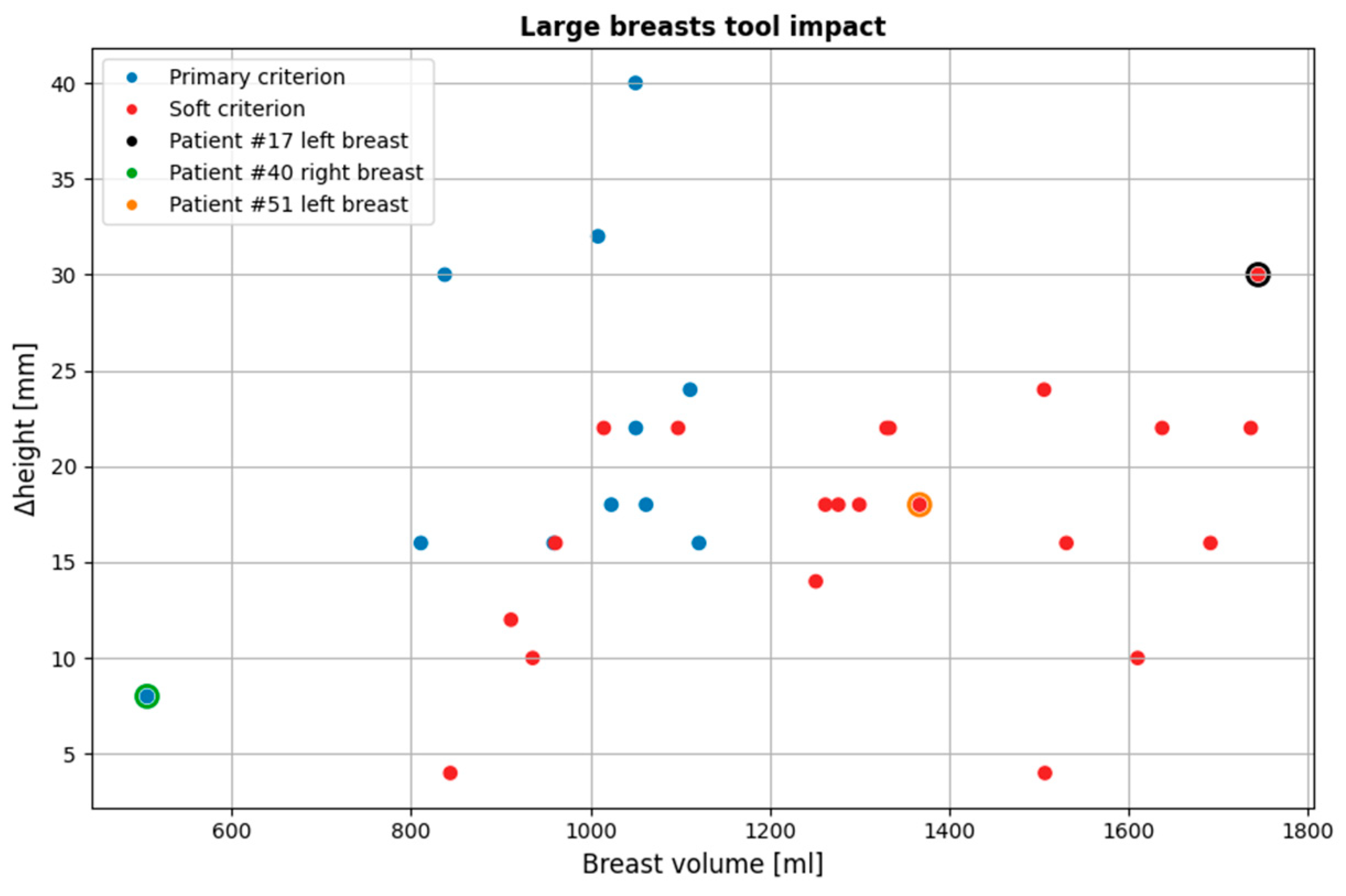 - Huang, N.S.; Quan, C.L.; Mo, M.; Chen, J.J.; Yang, B.L.; Huang, X.; Wu, J. A prospective study of breast anthropomorphic measurements, volume & ptosis in 605 Asian patients with breast cancer or benign breast disease. PLoS ONE 2017, 12, e0172122. [Google Scholar] [CrossRef]