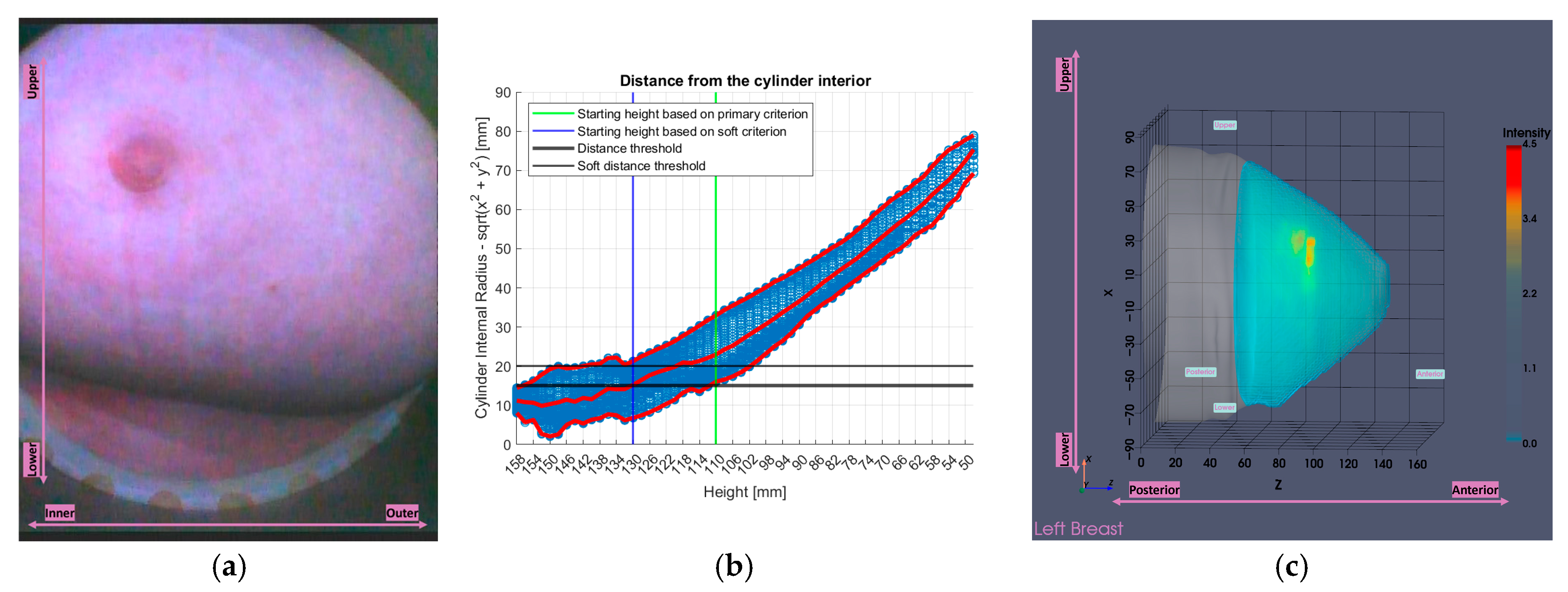 - Sarafianou, M.; Preece, A.W.; Craddock, I.J.; Klemm, M.; Leendertz, J.A. Evaluation of Two Approaches for Breast Surface Measurement Applied to a Radar-Based Imaging System. IEEE Trans. Antennas Propag. 2016, 64, 609–617. [Google Scholar] [CrossRef]