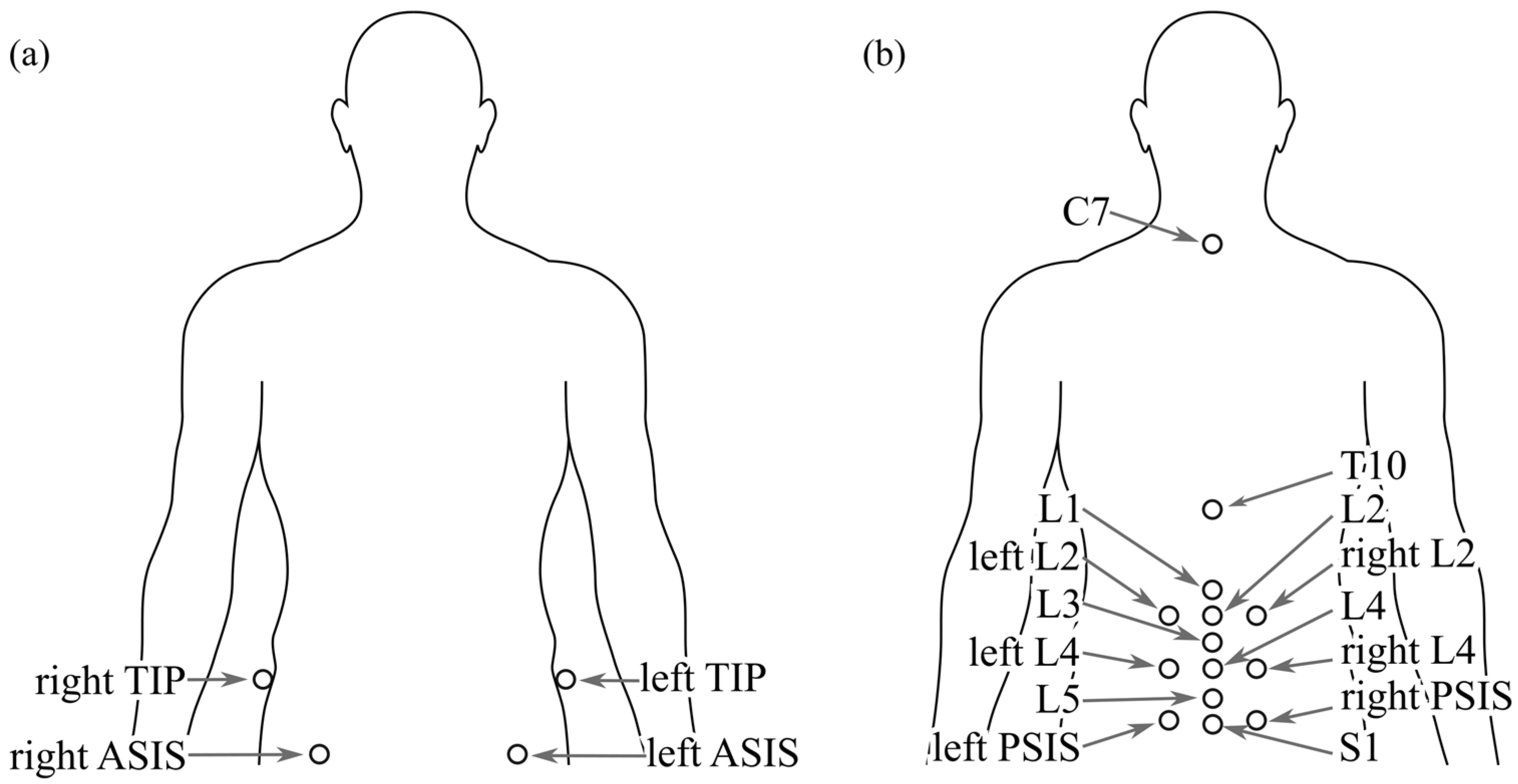 - Mörl, F.; Blickhan, R. Three-dimensional relation of skin markers to lumbar vertebrae of healthy subjects in different postures measured by open MRI. Eur. Spine J. 2006, 15, 742–751. [Google Scholar] [CrossRef] [PubMed]