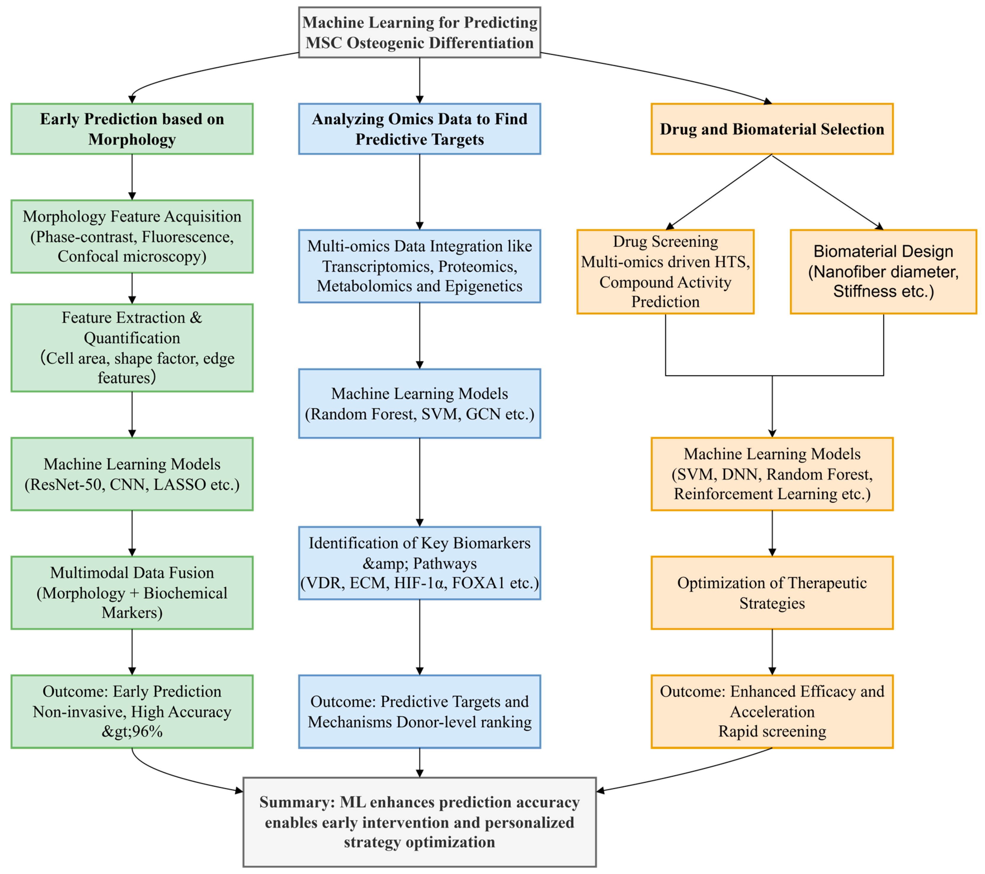 - Shi, Q.; Song, F.; Zhou, X.; Chen, X.; Cao, J.; Na, J.; Fan, Y.; Zhang, G.; Zheng, L. Early Predicting Osteogenic Differentiation of Mesenchymal Stem Cells Based on Deep Learning Within One Day. Ann. Biomed. Eng. 2024, 52, 1706–1718. [Google Scholar] [CrossRef]