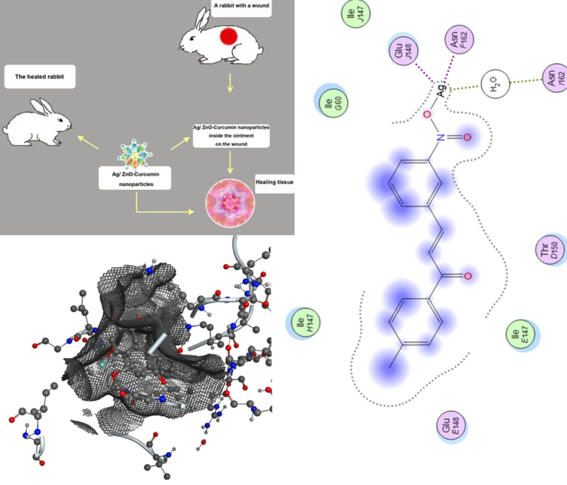 In this study, molecular docking was employed to evaluate the potential of curcumin and 1-(4-methylphenyl)-3-(3-nitrophenyl)-2-propen-1-one, a key component of Aloe vera gel, as effective agents for surface modification of Ag and ZnO nanoparticles for healing diabetic foot wounds. The interactions of these compounds and their nanoparticle-bound forms with the cell wall protein of Staphylococcus aureus were investigated (see Figure 2). This bacterium is a primary pathogen responsible for diabetic wound infections.