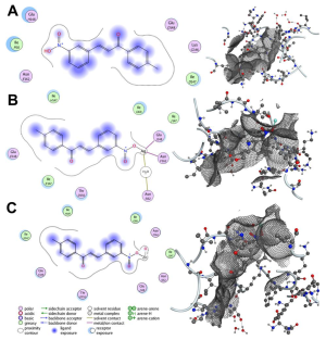 Figure 4. Interaction patterns and surface mapping of Protein A (cell wall protein of Staphylococcus aureus) with (A) 1-(4-methylphenyl)-3-(3-nitrophenyl)-2-propane-1-one, (B) surface-modified Ag, and (C) ZnO functionalized with 1-(4-methylphenyl)-3-(3-nitrophenyl)-2-propen-1-one. In each subfigure, the left panel displays the 2D interaction diagram, highlighting hydrogen bonds, hydrophobic interactions, and other significant binding forces between the ligand and amino acid residues of Protein A. The right panel presents the 3D surface representation of the protein binding pocket, showing the ligand docked within the protein’s active site.
