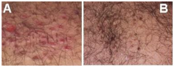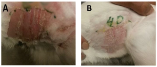 Figure 9. Skin of rabbits (A) before, and (B) after 4 days using Ag-ZnO nanoparticles modified by Curcumin (ointment and dressing pad).