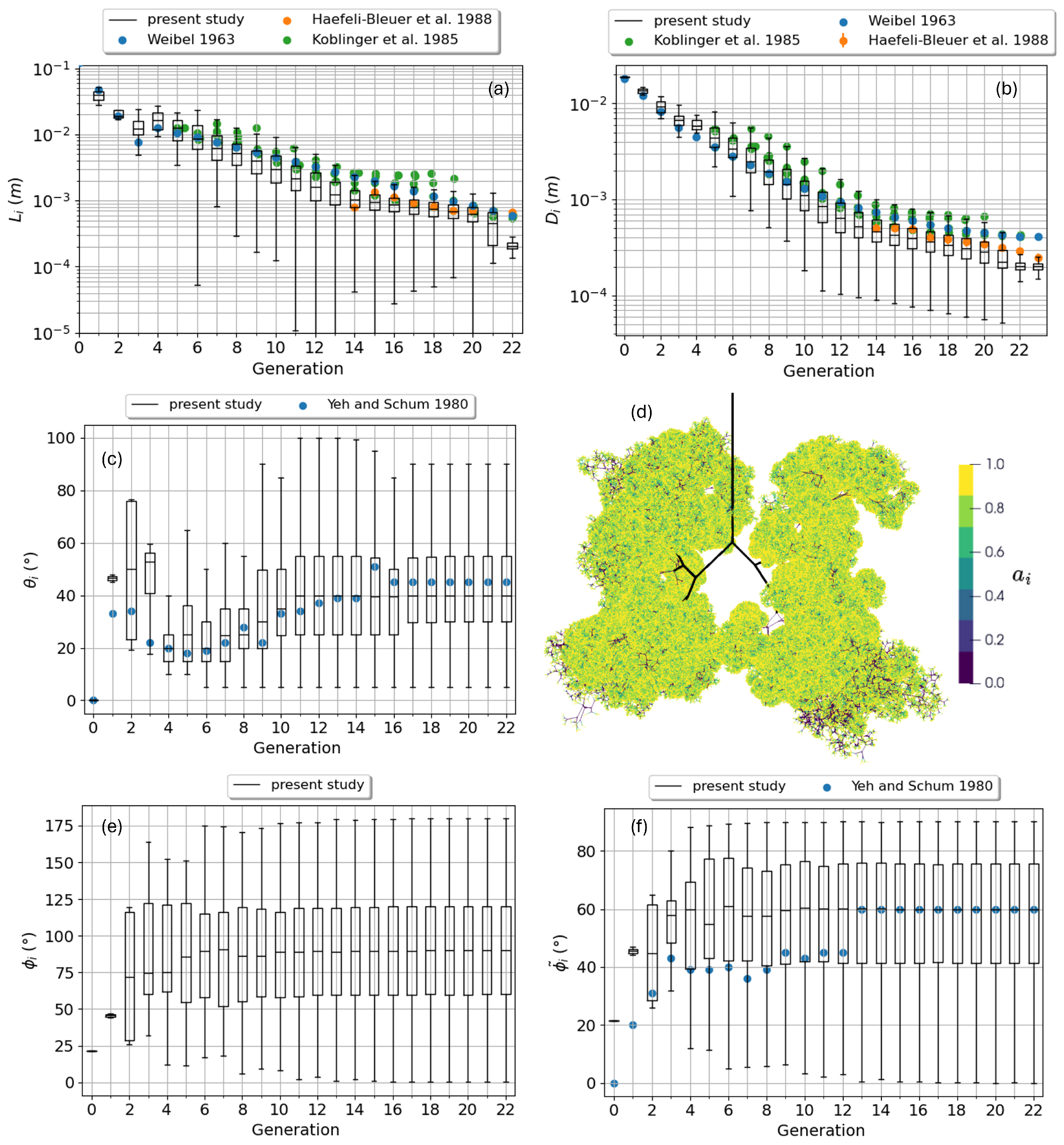 - Realistic patient-specific bronchial trees can be constructed. Their proximal airways can be efficiently and automatically extracted from large CT-scan databases thanks to recently developed machine learning-based algorithms [22,23,24,25]. If the lobe or sub-lobe volumes can also be extracted from CT-scans, volume-filling algorithms can be adopted to stochastically grow the deeper airways within them [26,27,28,29,30]. Complete bronchial trees with 23 or more generations can be easily constructed with realistic shapes and physiologically sound morphometric statistical distributions.