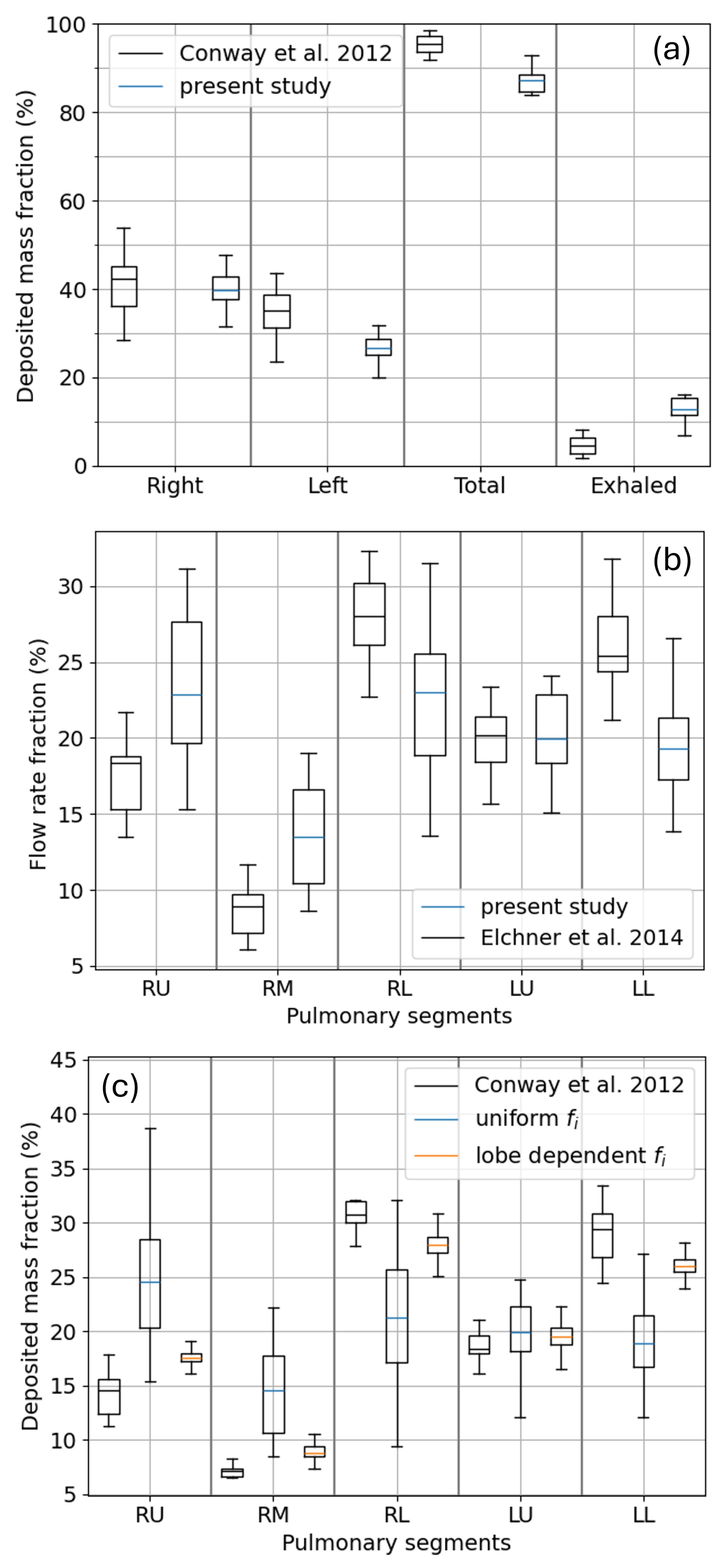 - Winkler-Heil, R.; Hussain, M.; Hofmann, W. Predictions of inter- and intra-lobar deposition patterns of inhaled particles in a five-lobe lung model. Inhal. Toxicol. 2021, 33, 96–112. [Google Scholar] [CrossRef]