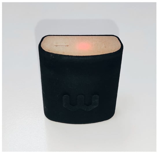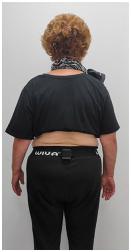 The measurement instrument used to assess gait parameters and events during the TUG test was the Wiva Science sensor (Wiva Science-LetSense Srl, Bologna, Italy) (Figure 1). The validated WIVA SCIENCE IMU is based on the technology of its predecessor prototype, the F4A. Accelerometer and gyroscope data were recorded at a frequency of 100 Hz, with sensitivities of ±1.5 G and ±300°/s, respectively. The device was positioned at the sacral region, aligned with the anatomical axes of the pelvis. Prior to dynamic acquisition, a five-second static calibration in bipedal stance was performed to obtain reference angles. Finally, the signals were filtered using a fourth-order Butterworth filter with a cut-off frequency of 8 Hz []. (Figure 2). Gait parameters from the IMU sensors [] were extracted using Biomech software (version 1.6.1.14687, LetSense Group Srl, Bologna, Italy).