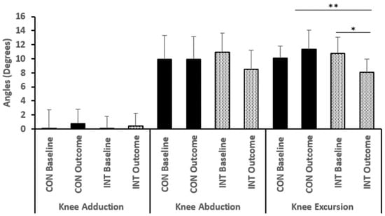 | Hip | MKF | Flexion | CON INT | 45.7 (11.7) 45.2 (11.1) | 46.1 (11.0) 38.8 (8.0) | 0.073 |