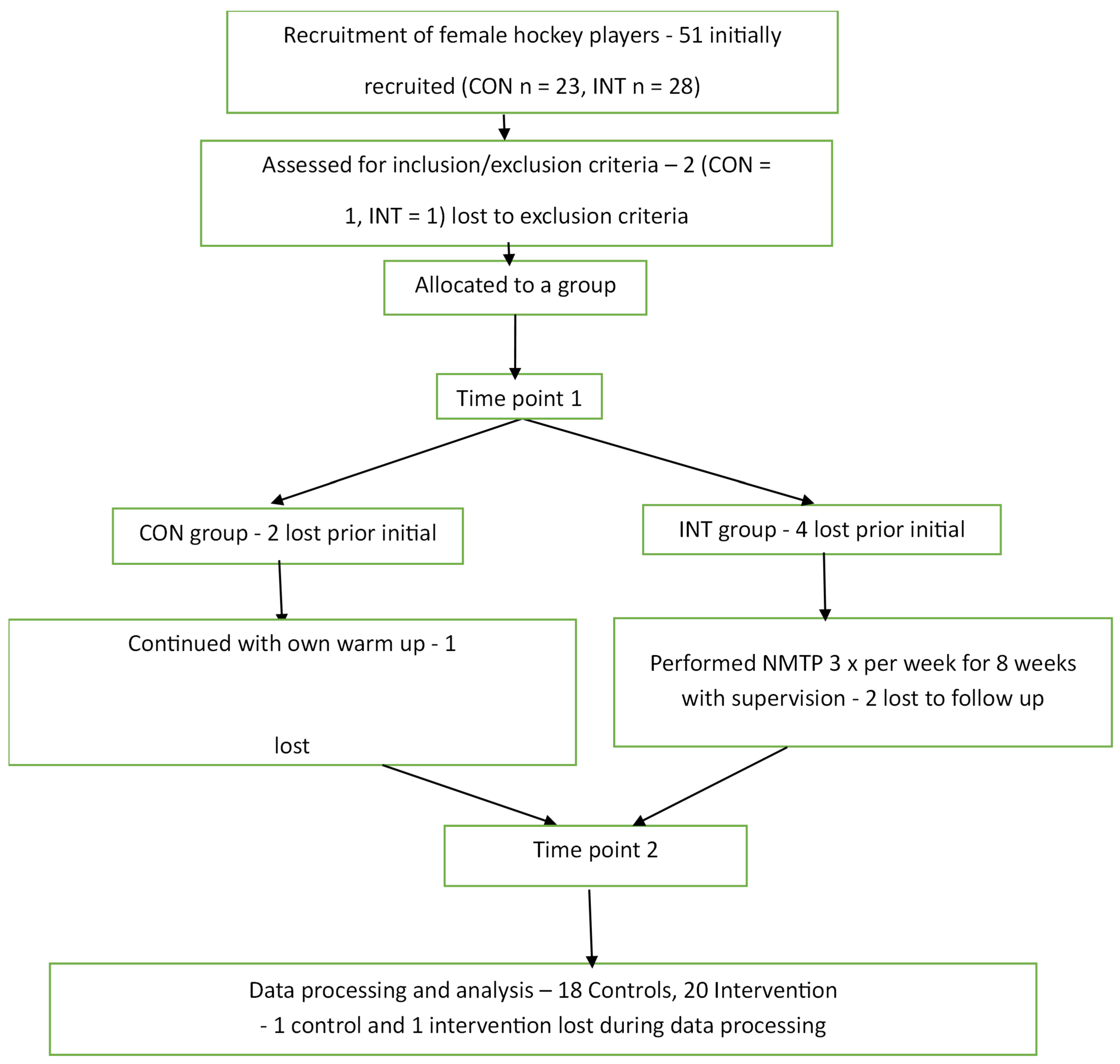 For the warm-up during the intervention, the control group carried on with 2 min of pulse raising, different static and dynamic stretches, and hockey-related skills and moves related to their teams’ usual activities, unlike the intervention group’s NMTP.