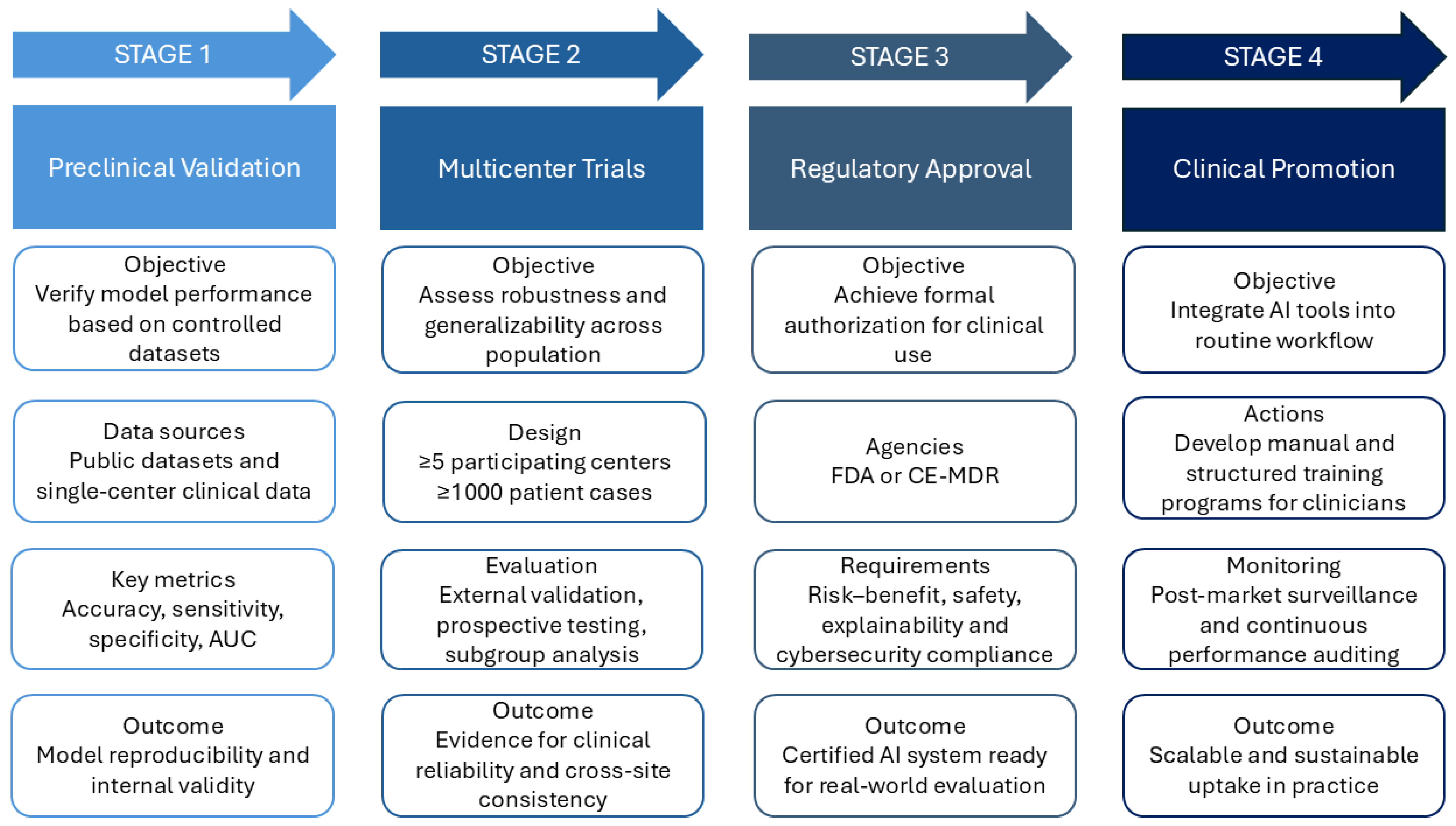 In summary, the clinical landscape indicates that AI has already produced tools with potentially meaningful impact in everyday practice. To make this impact systematic, mechanisms must be made explicit, training/validation criteria transparent, and the limitations hampering adoption acknowledged. Here, the engineering contribution is decisive: translating algorithms into robust, explainable, interoperable solutions; ensuring calibration, safety, and post-deployment monitoring; and enabling the prospective evaluation of clinically relevant endpoints.