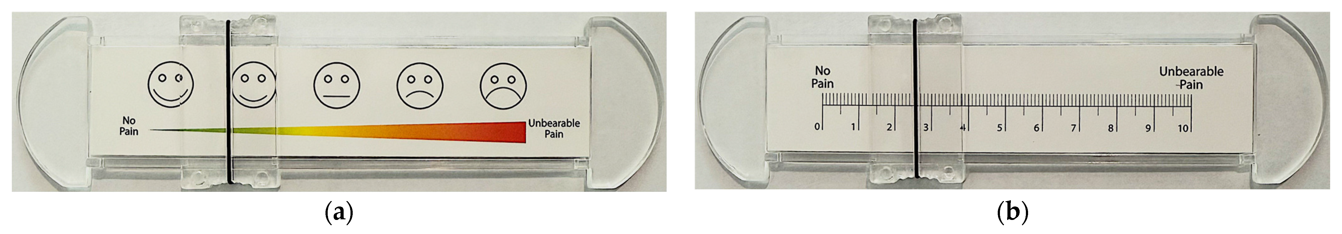 Figure 3. The VAS Rating Scale: (a) the emoticon side of the VAS Rating Scale; (b) the 10 cm millimeter scale side of the VAS Rating Scale.