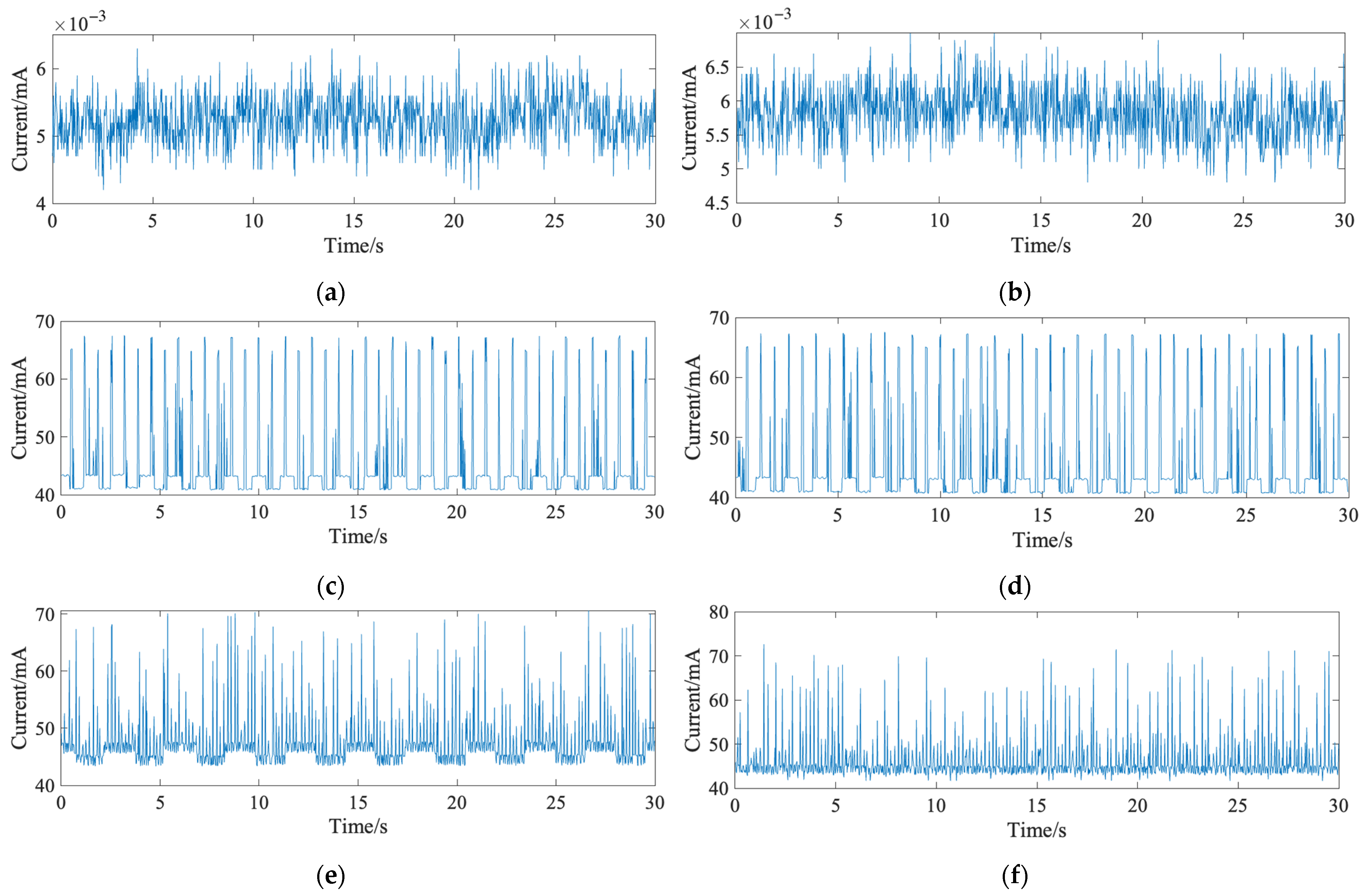Figure 4. The current waveforms of the system under different transmission strategies: (a) standby current waveform in single-packet transmission mode; (b) standby current waveform in multi-packet transmission mode; (c) operating current waveform in single-packet transmission mode; (d) operating current waveform in multi-packet transmission mode; (e) data transmission current waveform without signal detection in single-packet mode; (f) data transmission current waveform without signal detection in multi-packet mode.