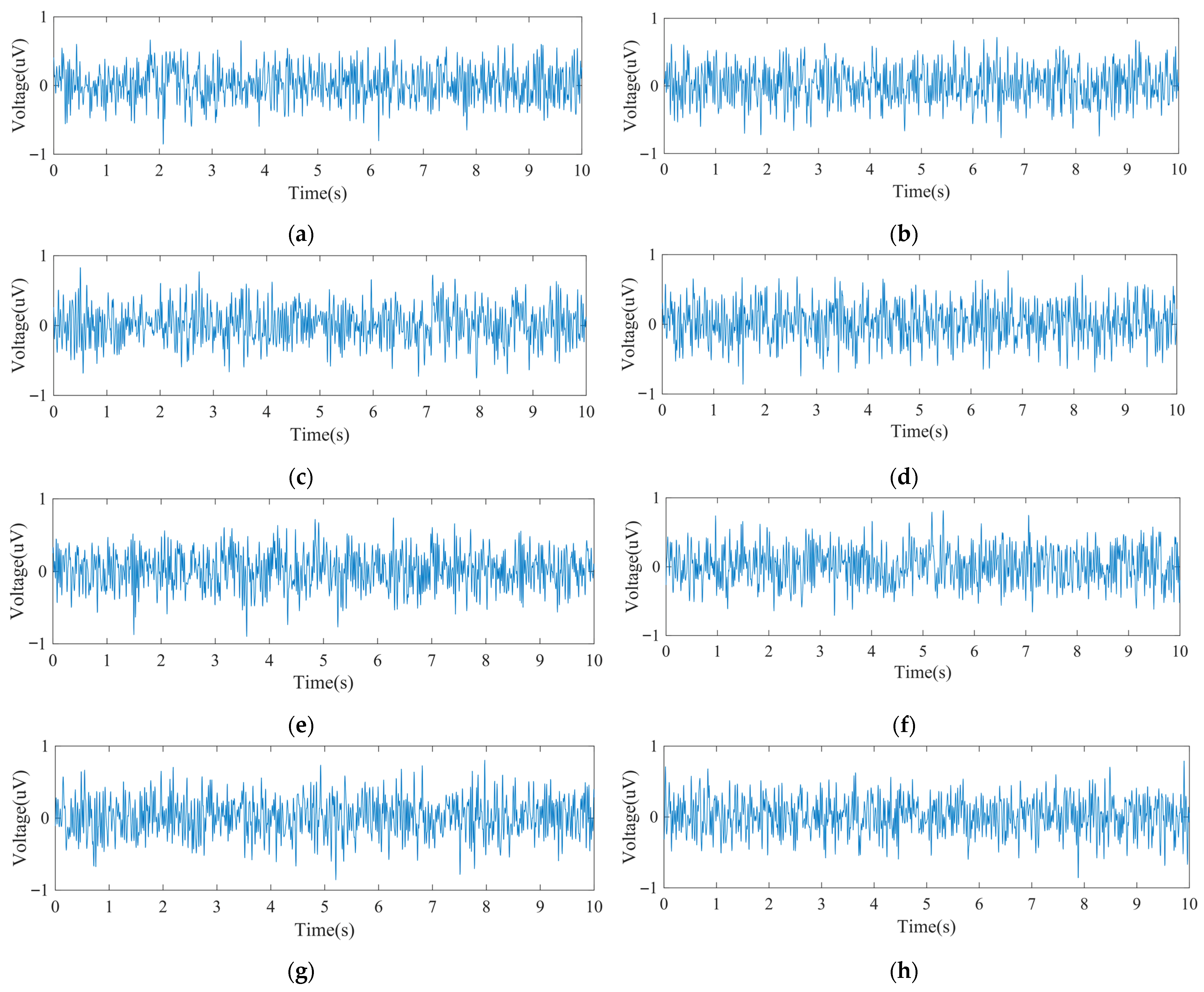 Figure 5. The input noise: (a) Channel 1 input noise waveform; (b) Channel 2 input noise waveform; (c) Channel 3 input noise waveform; (d) Channel 4 input noise waveform; (e) Channel 5 input noise waveform; (f) Channel 6 input noise waveform; (g) Channel 7 input noise waveform; (h) Channel 8 input noise waveform.