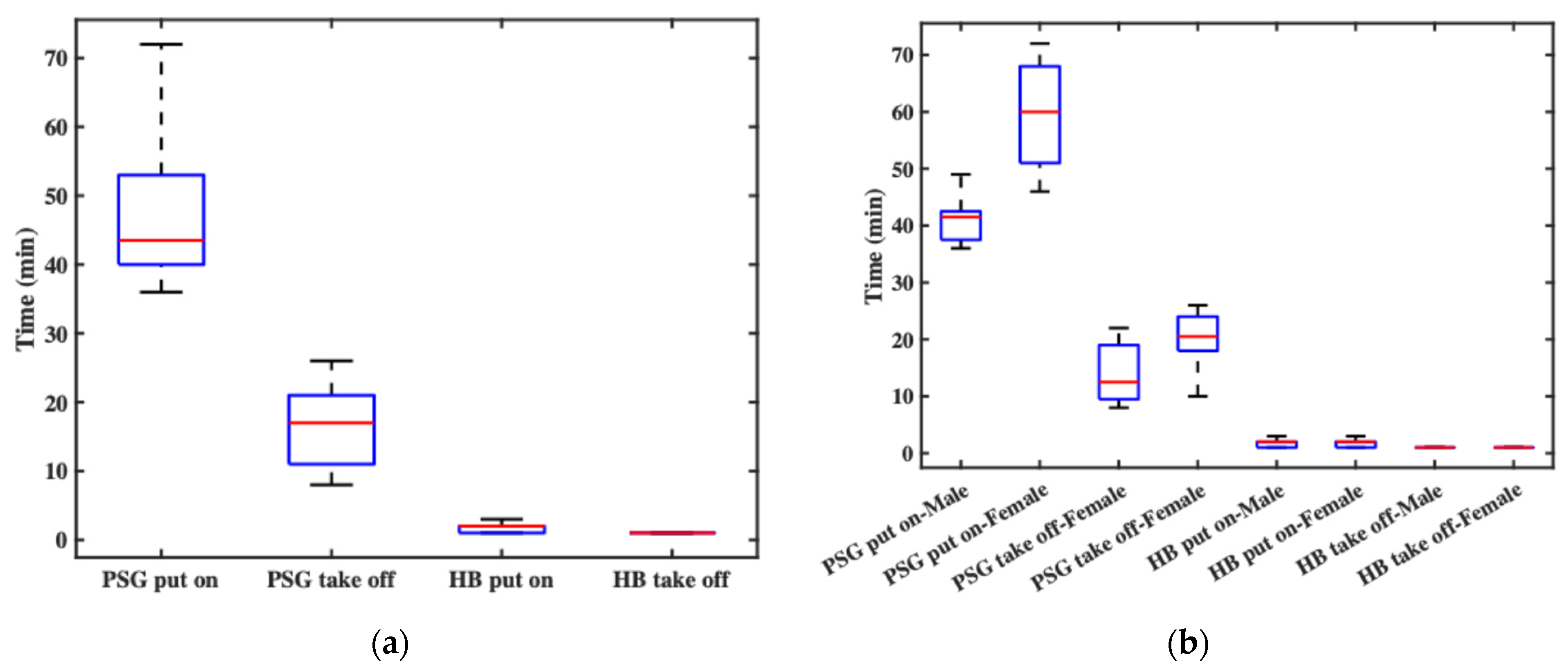 Figure 6 presents box plots of the recorded durations. Figure 6a shows overall statistics: the PSG donning time ranged from 36 to 72 min (a twofold difference), influenced by the experimenters’ experience and the participants’ characteristics (e.g., hair length) and cooperation. The average PSG donning time was 48 min. In contrast, the headband’s donning time ranged from 1 to 3 min, with an average of 1.8 min, mainly due to brief system debugging. This clearly demonstrates the headband’s superior donning efficiency. For doffing, the PSG required 8 to 26 min, averaging 16 min, largely affected by the participant’s condition. The headband, however, required less than one minute to remove. Figure 6b breaks down the results by gender. For male participants, PSG donning time ranged from 36 to 49 min, with an average of 40.9 min. For female participants, the time ranged from 46 to 72 min, averaging 59.4 min. In terms of PSG doffing, male subjects ranged from 8 to 22 min (average 13.9 min), while female subjects ranged from 10 to 26 min (average 19.5 min). The time required to don the headband was comparable between genders, ranging from 1 to 3 min, with mean durations of 1.9 min for males and 1.8 min for females. Doffing times for the headband were consistently under 1 min across all participants. These results indicate that both donning and doffing of the PSG system took significantly longer for female subjects, primarily due to longer hair. In contrast, the headband system showed no significant gender-based differences, indirectly confirming that hair length had minimal impact on its usability.