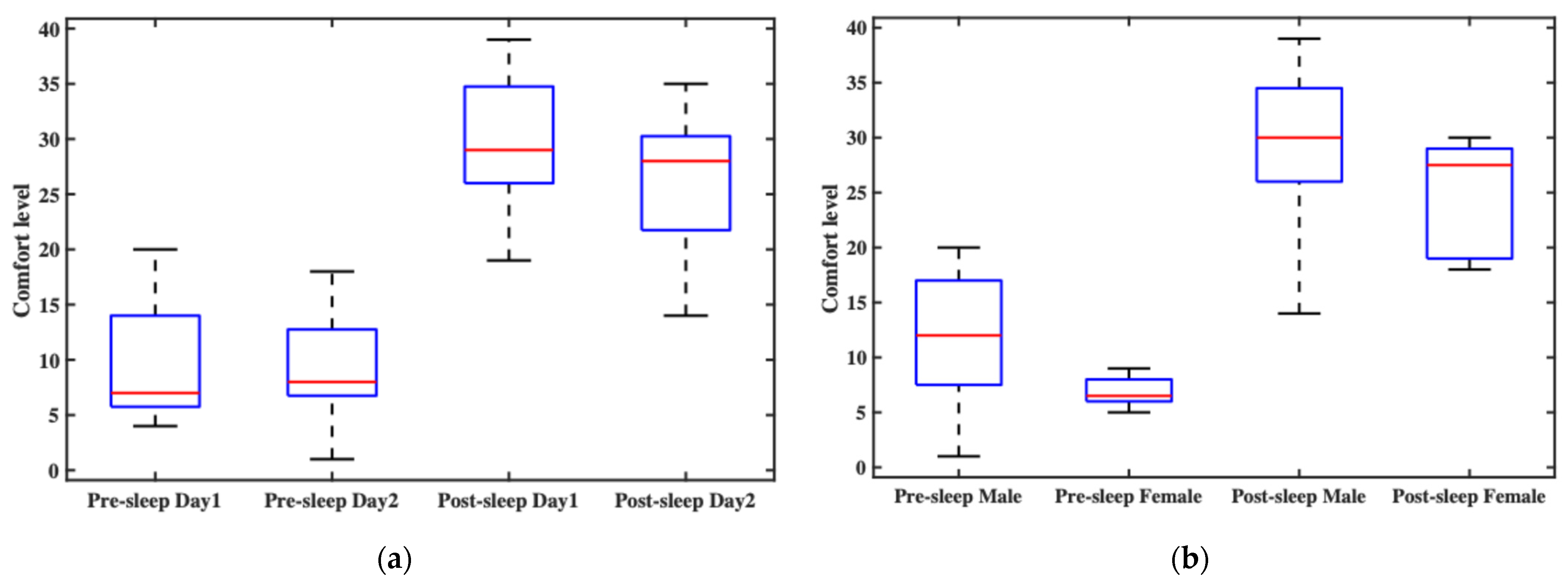 In this experiment, comfort level was statistically analyzed from two perspectives: time and gender. Figure 7a shows participants’ overall comfort ratings before and after sleep across two consecutive nights. The pre-sleep comfort levels generally fell within the “relatively comfortable” range, though slight variations were observed between the two nights, primarily due to the initial experience on the first night. Post-sleep comfort was slightly lower than pre-sleep but still remained within the “comfortable” range. Notably, post-sleep comfort on the second night was better than on the first, indicating that participants needed some time to adapt to wearing the headband throughout the night. Figure 7b compares comfort ratings between male and female participants. Regardless of whether the ratings were collected before or after sleep, female participants consistently reported higher comfort levels than male participants. This may be attributed to the fact that most female subjects had longer hair, which could have helped cushion the contact points and improve overall wearing comfort.