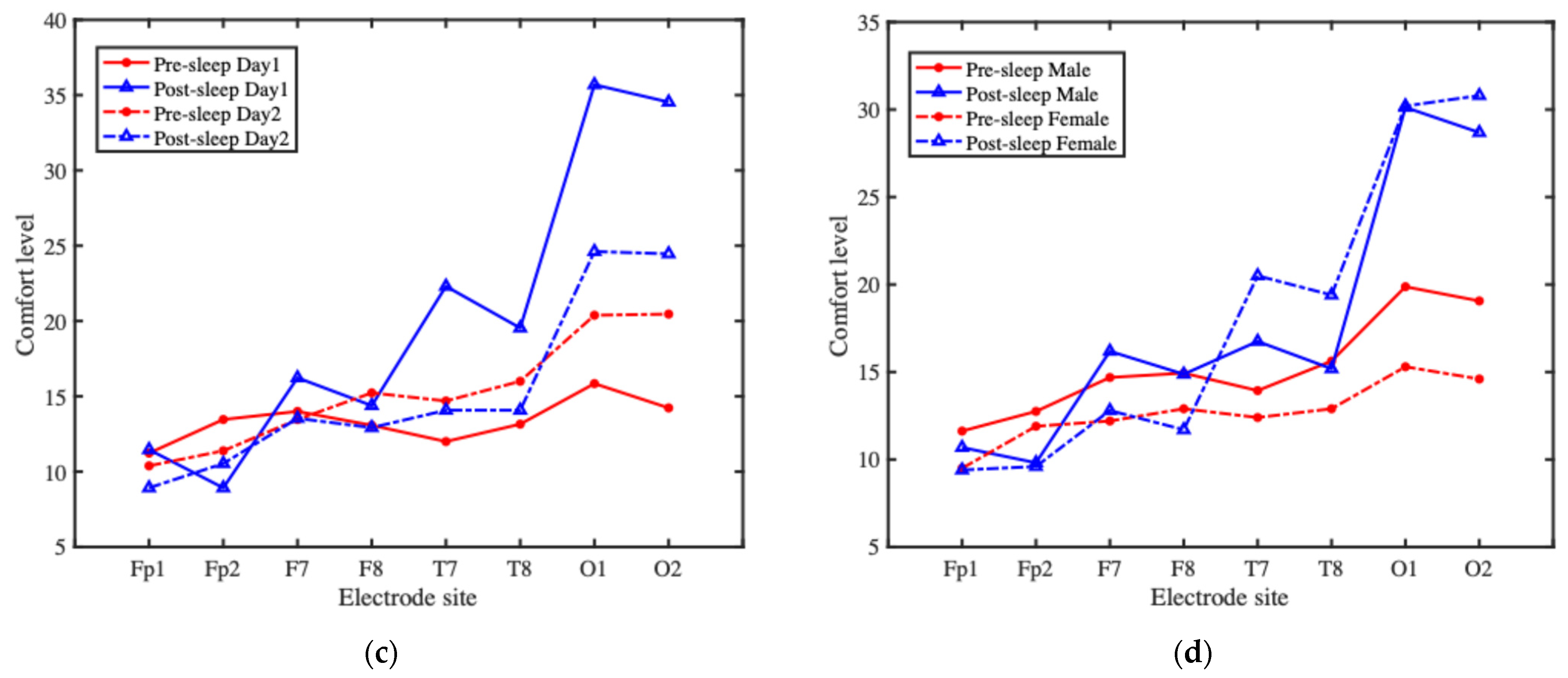 In the comfort rating scale, the overall comfort levels before and after sleep were treated as two independent items. In addition, the comfort levels of each electrode site before and after sleep were treated as 16 independent items, resulting in a total of 18 items. The responses from the two experimental nights were treated as two separate datasets for analysis. The calculated Cronbach’s alpha coefficient for the comfort scale was 0.9345, indicating excellent internal consistency and demonstrating that the scale provides reliable and consistent results.