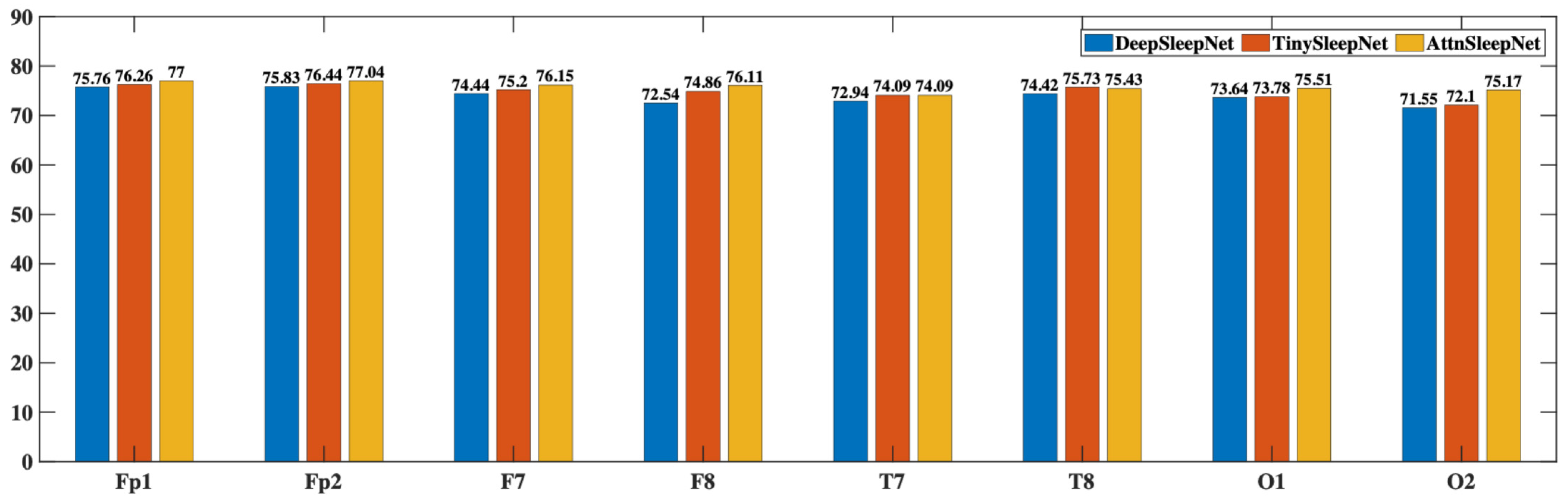Figure 8 shows the accuracy performance of each channel’s data across different models. It is clear that AttnSleepNet achieves the best accuracy on every channel, with the highest single-channel accuracy reaching 77.04% at the Fp2 channel. Following that is TinySleepNet, with its highest accuracy also at the Fp2 channel at 76.44%. DeepSleepNet shows relatively lower accuracy, with its highest at Fp2 channel of 75.83%. These results suggest that prefrontal EEG channels (Fp1 and Fp2) provide the most reliable signals, likely due to fewer motion artifacts during sleep. In contrast, occipital channels (e.g., O1 and O2) showed slightly lower accuracy, possibly due to pillow contact or head movements during sleep, which interfere with signal quality.