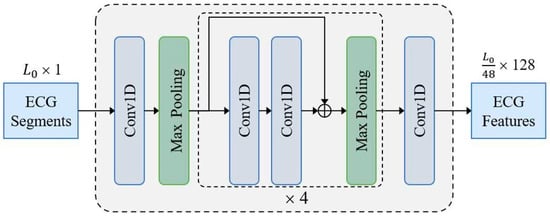 Methods based on overall ECG information do not explicitly extract ventricular rhythm information or atrial morphology information but instead employ deep neural networks to achieve end-to-end AF detection. CNN backbones are commonly used for automatic feature extraction from ECG signals [,]. Some studies further refine the features extracted by CNN backbones using LSTM [,,,], GRU [], and transformer encoders [].