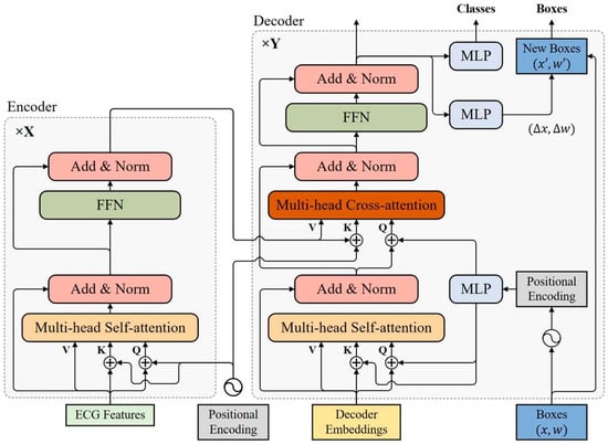 The cross-attention module in the decoder also uses a multi-head attention mechanism. In the cross-attention module, positional and content information are combined as object queries to extract object information from the encoded ECG features. The input of the cross-attention module in the d-th decoder layer can be expressed as: