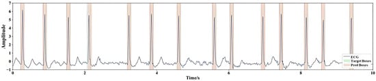 During training, all other settings (optimizer, learning rate, epoch number, and dataset split) were identical. The matching between predicted and ground-truth boxes was still performed by the Hungarian algorithm to ensure one-to-one correspondence, thereby preventing collisions when boxes overlapped at high heart rates. The center position and width of each box are normalized to [0, 1]. Figure 3 visualizes the setup for the ground truth boxes and the desired effect of the predicted boxes. For the transformer part, we use 4 encoder layers and 4 decoder layers, with each feature length set to D = 128. The number of heads for multi-head attention is set to H = 8. During training, we use the adaptive moment estimation algorithm (Adam optimizer) to optimize the model. The hyperparameters involved in the network are manually fine-tuned. Finally, the cost coefficient for bipartite matching is determined as , and the loss function coefficient is . The initial learning rate is set to 0.0001, and the batch size is 64. The formula for the learning rate change with training epochs is: