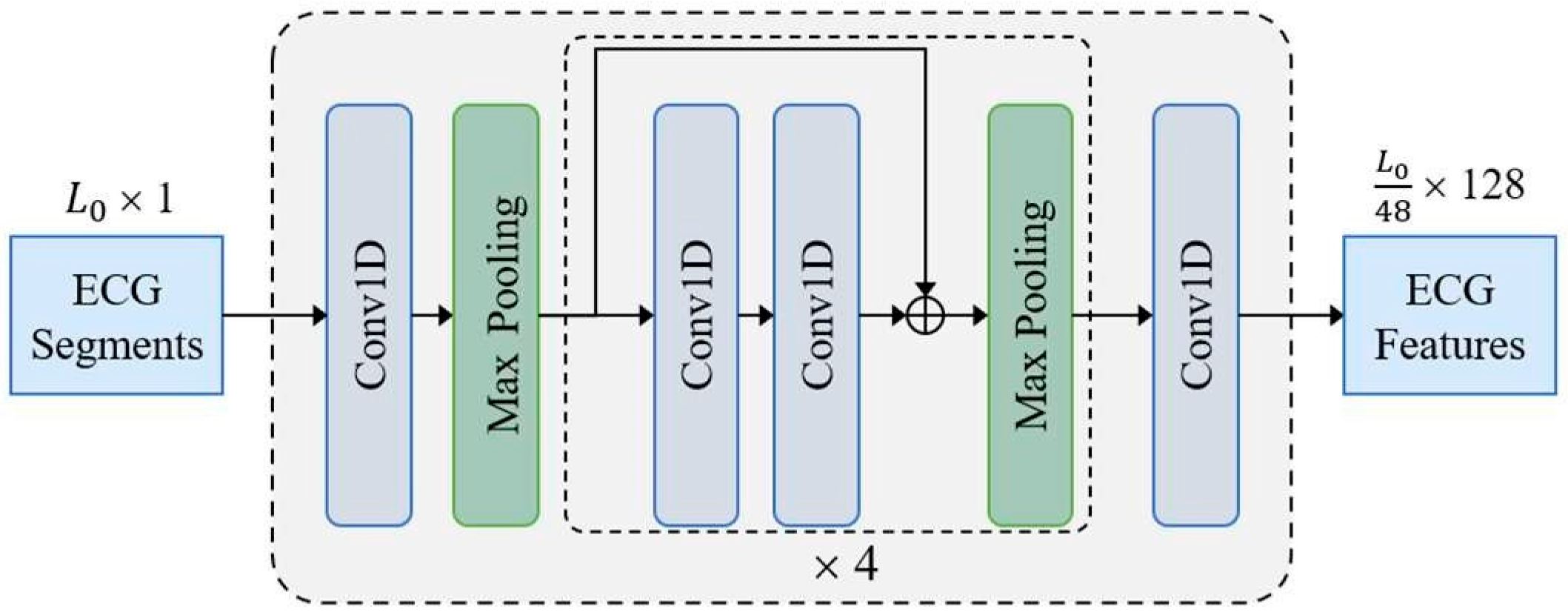 is fed to a 1D convolution layer and four residual blocks to acquire a compact ECG feature representation. Finally, the number of feature channels is adjusted to