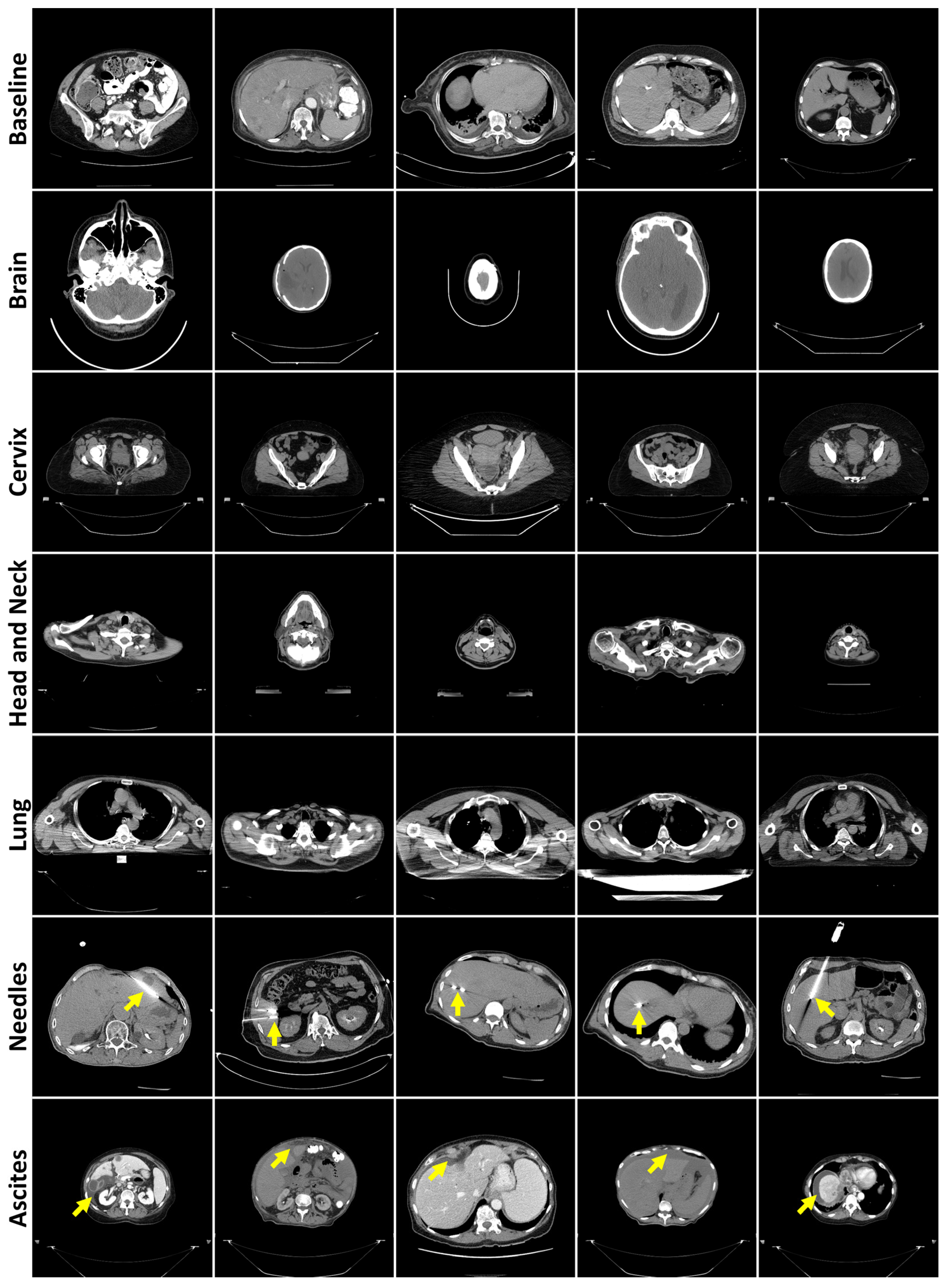 Figure 1. Representative axial CT slices from each failure detection test dataset, separated by rows. Yellow arrows highlight the presence of needles (row 6) or ascites (row 7).
