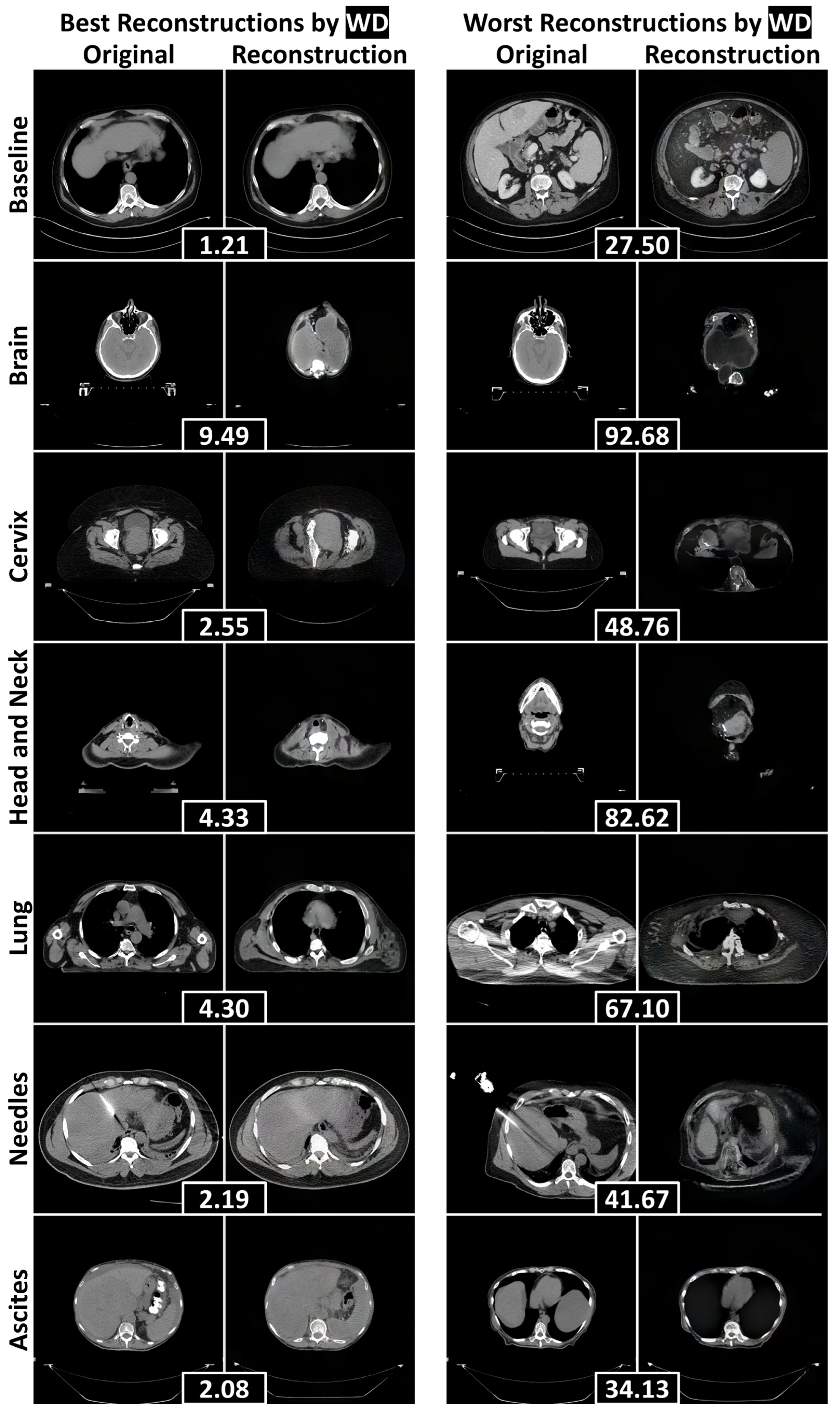 Figure 4. The best and worst reconstructions (according to the WD calculated within the human body) for each failure detection test dataset, separated by rows. WDs between an original axial abdominal CT slice and its reconstruction are included in black boxes between the pair. Abbreviations: Wasserstein distance (WD).