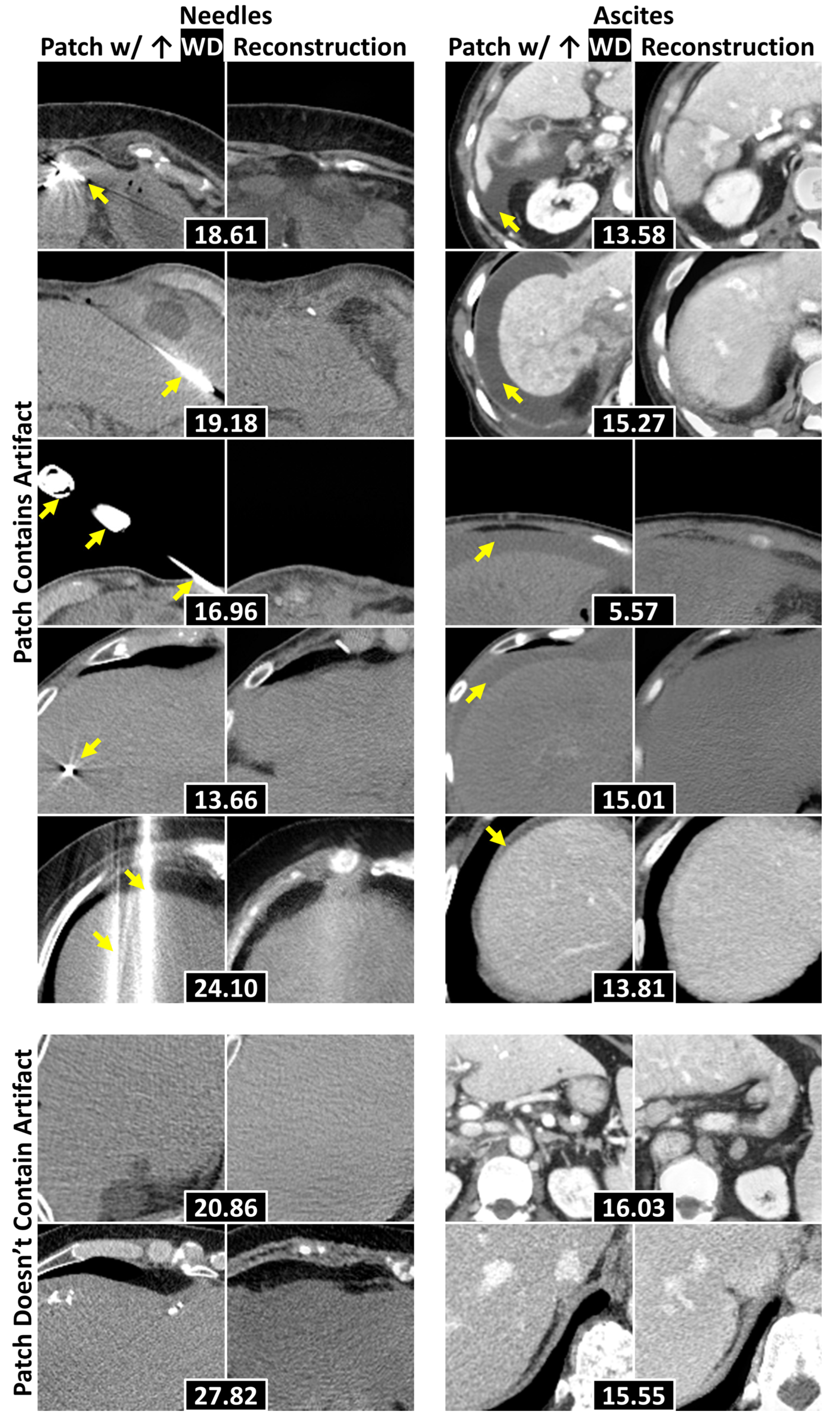 Figure 6. Example 128 × 128 patches of axial abdominal CT slices with their corresponding reconstructions. Each pair attained the highest WD within a slice, with WDs placed in black boxes. The top five rows display examples where the evaluated anomalies (e.g., needles and ascites—separated by columns) were localized, with yellow arrows pointing to the anomalies. The bottom two contain examples where the anomalies were not localized. Abbreviations: Wasserstein distance (WD).