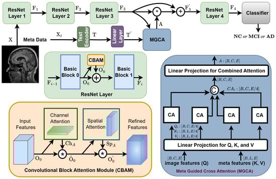 This study presents a novel NeuroNet-AD model that utilizes image and meta-features using Meta-Guided Cross-Attention (MGCA) for better fusion of both image and text modalities to improve the diagnosis of AD stages. NeuroNet-AD, as presented in Figure 1, has four main modules, including ResNet-18 with Convolutional Block Attention Modules (CBAMs), a Text Encoder, Meta-Guided Cross-Attention (MGCA), and a final classification layer. The model utilizes a ResNet-18 backbone for image feature extraction, enhanced by CBAM to refine important spatial and channel-wise features. We chose ResNet-18 because its moderate depth balances feature capacity with overfitting risk on limited data. A pre-trained BERT model is used as the text encoder to generate language embeddings for incorporating text information. These embeddings are fused with image features through the MGCA mechanism, facilitating better cross-modal feature alignment. Finally, a classifier processes the combined feature representation to produce the final result.