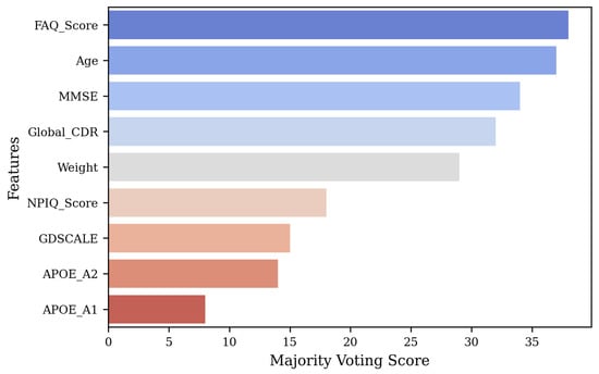 Let denote the rank of feature f assigned by ensemble model m. We compute a weighted vote , where is the weight of model m (equal weights in our case). The scores are normalized as and the features with the top scores are selected. The total votes for each feature were then normalized to compute confidence scores, representing the proportion of votes received relative to the total. Finally, the features were ranked based on their majority voting scores, with the top five retained features being FAQ-Score, Age, MMSE, Global-CDR, and Weight, which demonstrated the highest importance across all models. Figure 2 shows the feature selection results.