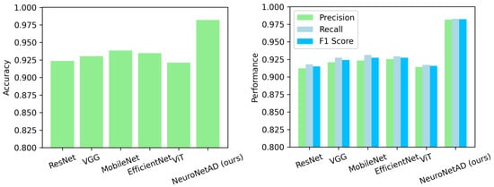Figure 3 compares NeuroNet-AD with several baseline models across four evaluation metrics: accuracy, precision, recall, and F1-score. Across all metrics, NeuroNet-AD consistently demonstrates superior performance with notable improvements over competing methods.