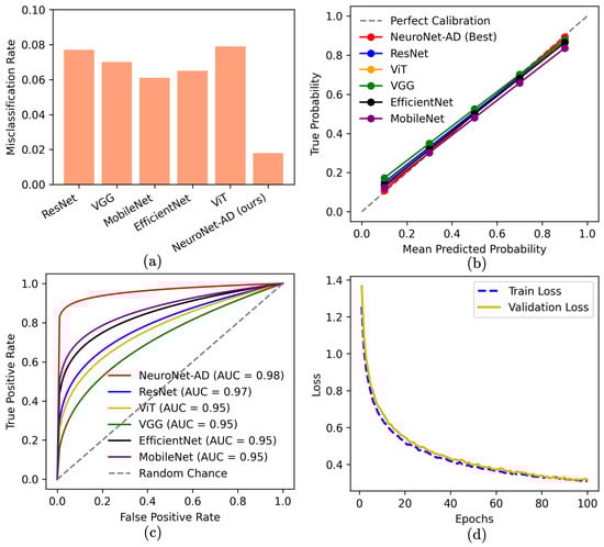 Performance of NeuroNet-AD vs. baselines: (a) misclassification rates (lowest for NeuroNet-AD), (b) calibration curves (best alignment), (c) Receiver Operating Characteristics (ROC) curves with Area Under Curve (AUC), and (d) training/validation loss over epochs (smooth convergence).