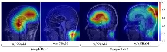 The figure demonstrates that the model with CBAM focuses more precisely on relevant features compared to the model without CBAM. We computed Class Activation Maps (CAMs) using the feature maps from the conv3 layer of the final bottleneck block in model.layer4 (i.e., model.layer4[-1].conv3) of the ResNet architecture. Each CAM pair (left: without CBAM; right: with CBAM) is aligned for the same input MRI slice to visually demonstrate CBAM’s effect. The resulting visualizations highlight that the model focuses on the relevant spatial regions to make class predictions.