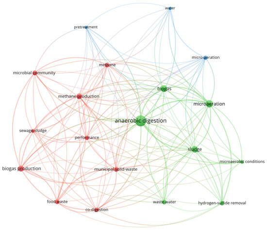 Keyword co-occurrence map focusing on anaerobic digester studies published in the last ten years (2016–2025). Different colors represent distinct clusters of closely related keywords.