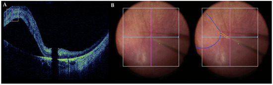Figure 4. (A) Visualization of the subretinal bleb with intraoperative OCT. A shadow created by the subretinal cannula is seen. (B) En face view of subretinal bleb (blue overlay) and extendable small gauge subretinal cannula (orange overlay) through microscope-integrated heads-up display. The pink and sky-blue overlays represent the vertical and horizontal axis, respectively.