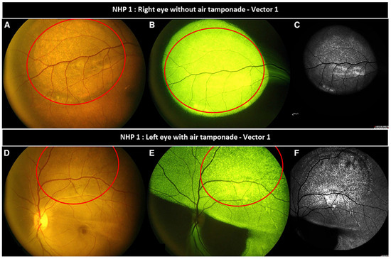 Figure 5. (AC) Vector (unmodified AAV2) distribution is limited to the injection site area in the eye without air tamponade. (DF) Vector distribution migrates beyond the initial bleb in eyes with post-injection air tamponade. The red circle represents the bleb distribution. Retrieved from Intravitreal air tamponade after AAV2 subretinal injection modifies retinal EGFP distribution [33].