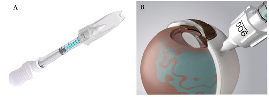 Figure 8. (A) Clearside suprachoroidal space (SCS) microinjector. (B) Illustration of suprachoroidal injection with the Clearside SCS microinjector. Retrieved from Clearside Biomedical, Inc. (Alpharetta, GA, USA). [57].