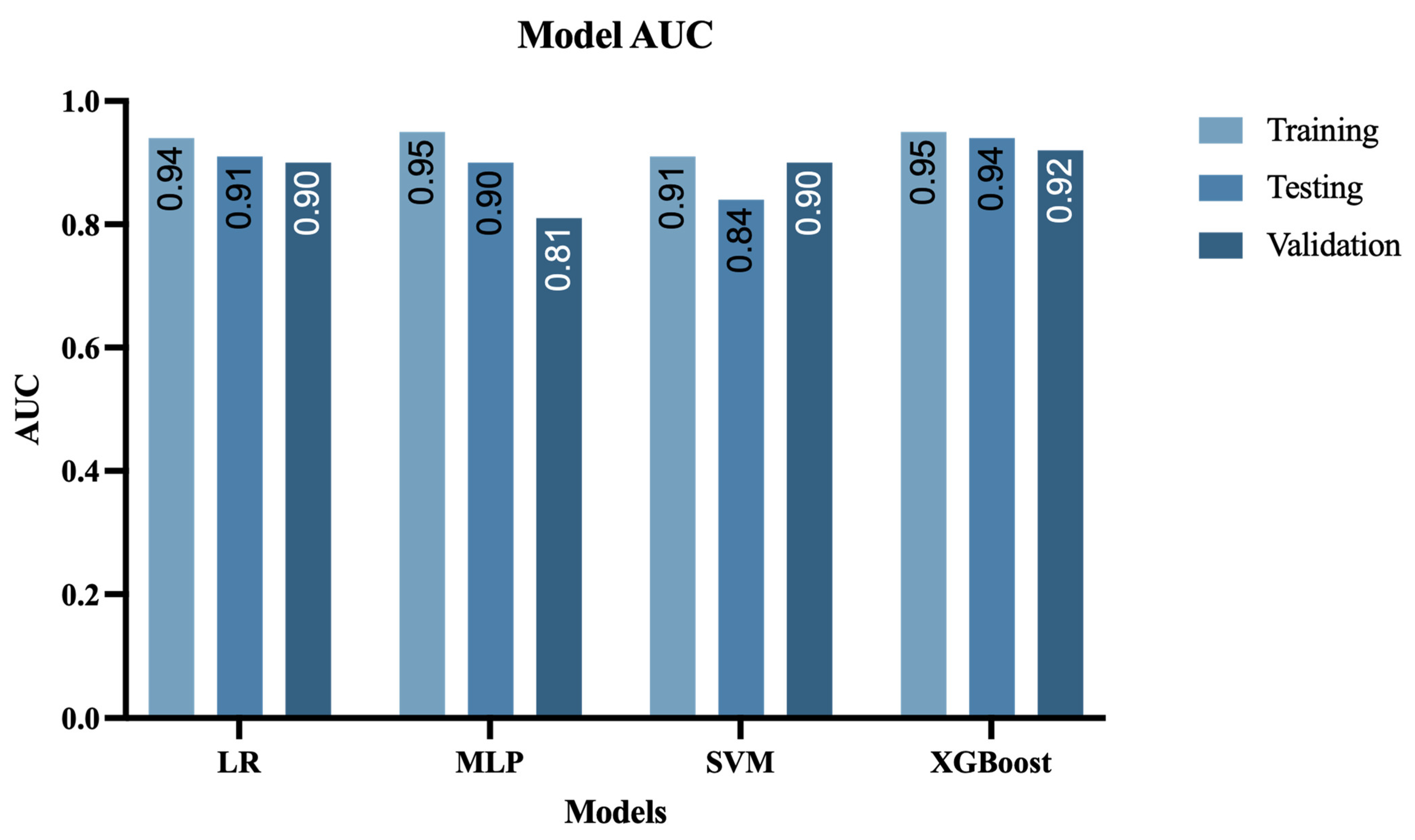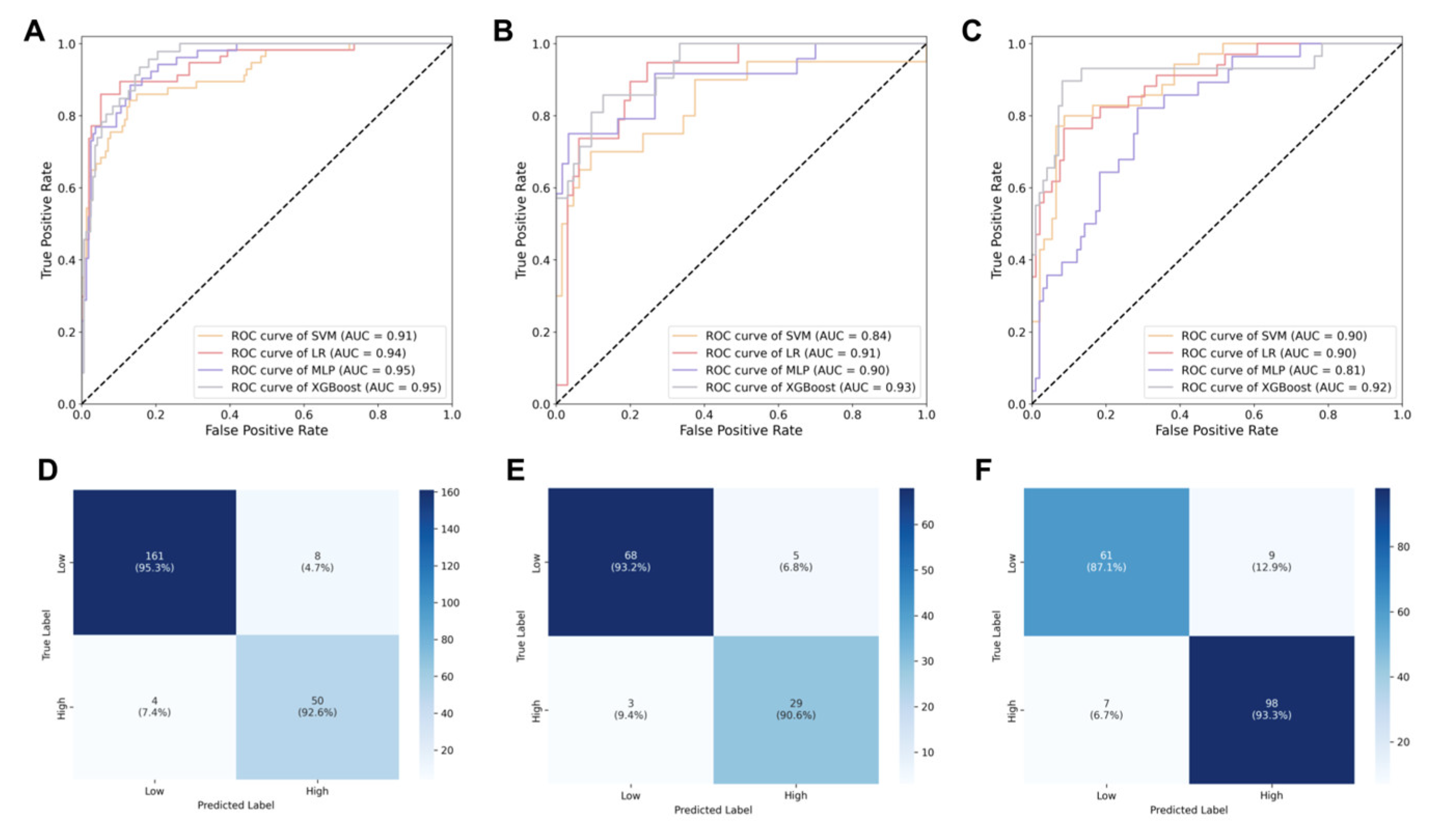 | XGBoost | 0.95 (0.92, 0.98) | 0.95 (0.92, 0.97) | 0.95 (0.88, 0.94) | |