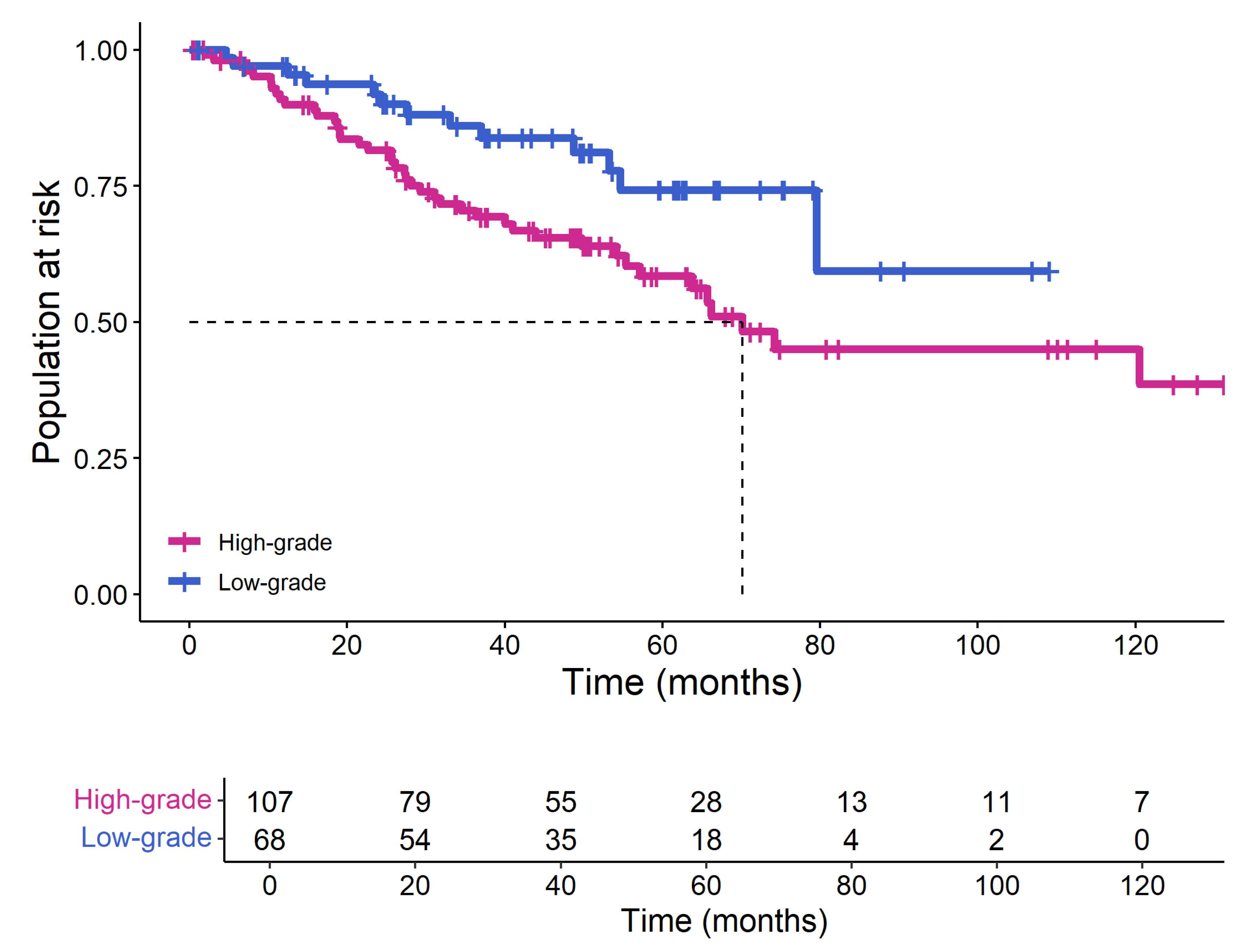 | High-grade | 86 (26%) | 54 (24%) | 32 (30%) |