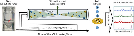 In addition to the large variety of IOL designs and materials, there are two challenges when it comes to detecting particle release of IOLs. First, IOLs can remain in the body for years and even decades, so monitoring the particle release over long periods is necessary. Second, the amount of released particles over a period that is accessible under laboratory conditions is expected to be small. The combined quantification and identification of nanoplastics at low concentrations remains an ongoing challenge [21]. A recent extensive study of current detection methods concluded that any analytical technique on its own is limited, if a combination of morphological characterization, chemical identification and/or quantification is required, suggesting that increased use of the combination of several methods is the way forward [22]. In this work, we combine OptoFluidic Force Induction (OF2i), a novel online particle counting method, with μ-FTIR-ATR and Raman microscopy. As indicated in Figure 1, this combination allows us to monitor particle counts at different times during an experiment, whilst also identifying the particle composition at the end of the experiment.