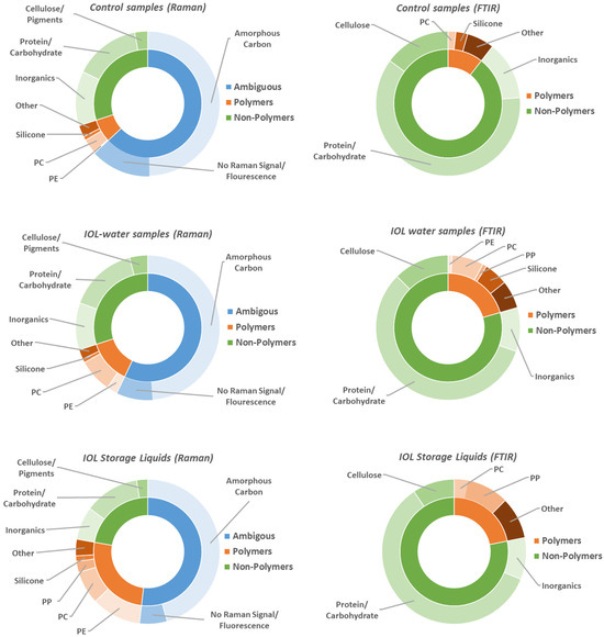 With the exception of the Rayner RayOne Storage Liquid, no increased particle counts were found in the OF2i measurements. The main questions in the Raman and FTIR measurements are, therefore, can we find any particles from the IOLs at all, and what is responsible for the higher particle count in the storage liquid? Since automated measurements were not possible, as described in the method section, manually at least 40 particles (mostly <10 μm) were measured with Raman microscopy and 15 particles (mostly >10 μm) with FTIR microscopy for each sample. Note that the particles were sparsely distributed and that the filters appeared almost empty under the light microscope. The results of the Raman and FTIR measurements are summarized in Figure 2 by sample type (control samples, IOL water sample and IOL storage liquid). The full dataset can be found in Table S1 (Raman) and Table S2 (FTIR) in the Supplementary Material.