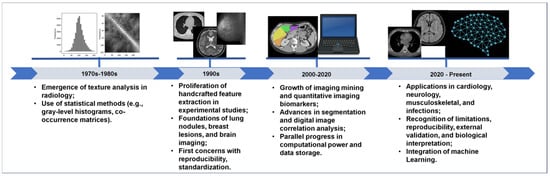 During the 1980s and 1990s, several researchers began to experiment with statistical texture descriptors, including co-occurrence matrices, run-length features, and fractal-based metrics, to differentiate benign from malignant lesions, particularly the imaging of breast, lung nodules, and brain tumors [21,22,23]. However, these approaches were often limited by computational constraints, heterogeneous imaging protocols and absence of standardized feature definitions. Despite their technical promise, they remained largely within academic environments, with limited clinical translation. Figure 1 illustrates key milestones in the historical development of radiomics, moving from early texture analysis to modern AI-integrated workflows.