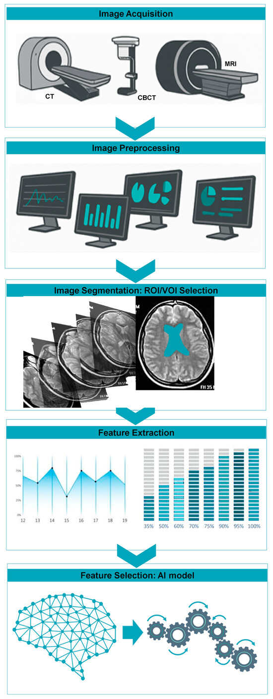 Relevant literature was identified through targeted and iterative searches of electronic databases, including Web of Science, PubMed, Scopus, and Google Scholar. The keyword combinations used in the search strategy included the following: “radiomics”, “texture analysis”, “quantitative imaging,” “computed tomography”, “cone beam computed tomography”, “magnetic resonance imaging”, and “artificial intelligence”. No restrictions regarding publication date or study type were imposed.