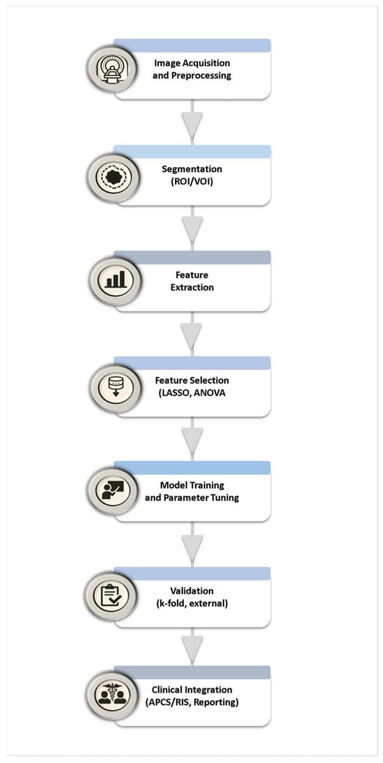Figure 3. Radiomics experimental workflow: Overview of the complete radiomics pipeline, from image acquisition and preprocessing to clinical integration. The diagram summarizes key stages including segmentation of regions or volumes of interest (ROI/VOI), feature extraction, selection, model training, validation, and incorporation of radiomics-based biomarkers into PACS/RIS and structured radiology reporting.